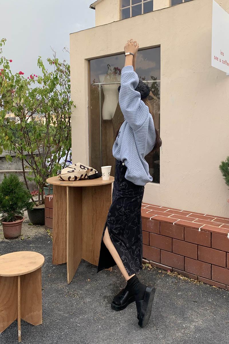 This abstract faces denim midi skirt merges art and fashion with a playful vibe. The structured silhouette and comfy waistband make it easy for daily wear or weekend fun.
