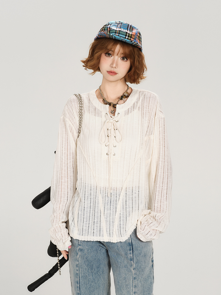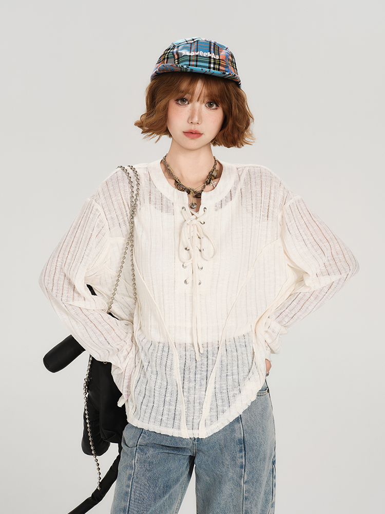 Embrace the summer sun with our American Retro Lace-Up Hollow Sun Protection Shirt for Women, designed for the ultimate blend of style and comfort. This casual, loose-fitting top features a slimming silhouette that flatters every body type, while the lace-up detailing adds a trendy touch. Crafted with breathable fabric, it ensures you stay cool and protected during those warm days. Elevate your wardrobe and enjoy effortless chic—add this versatile piece to your cart today!