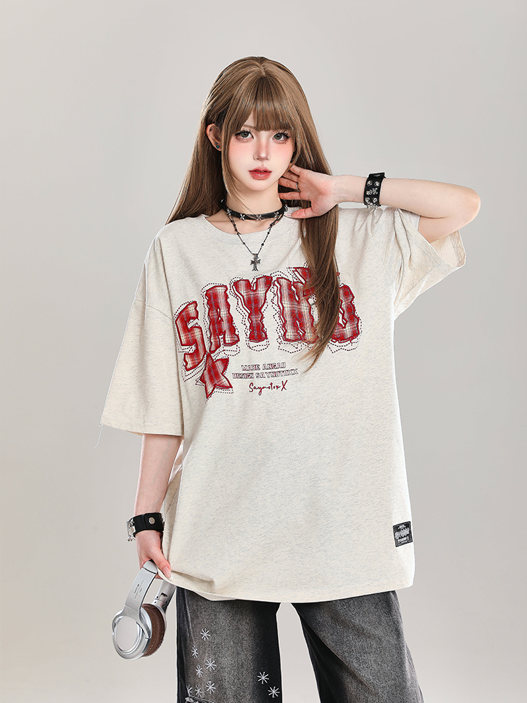 Retro Letter Embroidery Short Sleeve Women Loose Fit College – Outfit Ideas