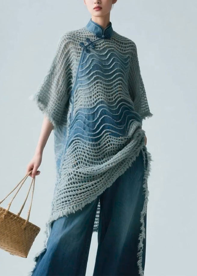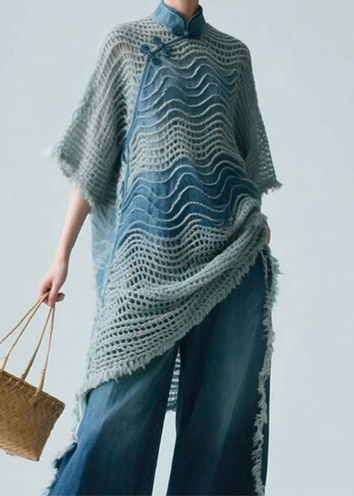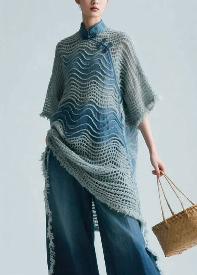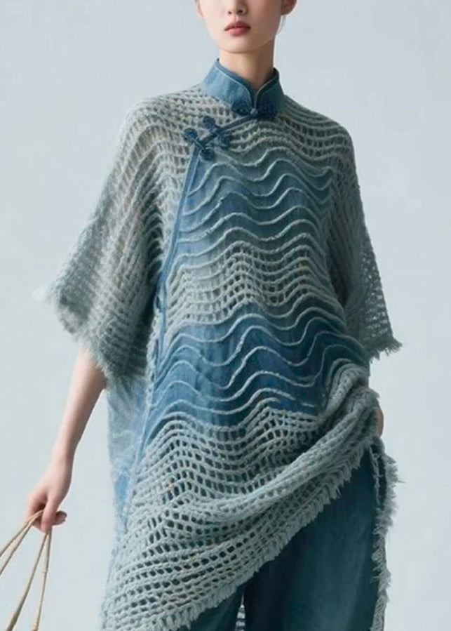 Art Blue Stand Collar Hollow Out Knit Shirt Half Sleeve