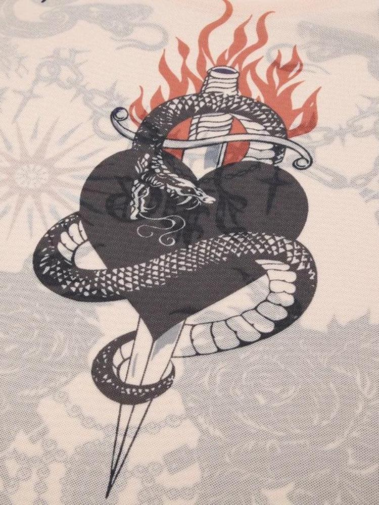 - Tattoo print details: heart, snake, stripes, sun, sword, barbed chain, flame, roses, stones, flowers, lightning, leaf, jewelry