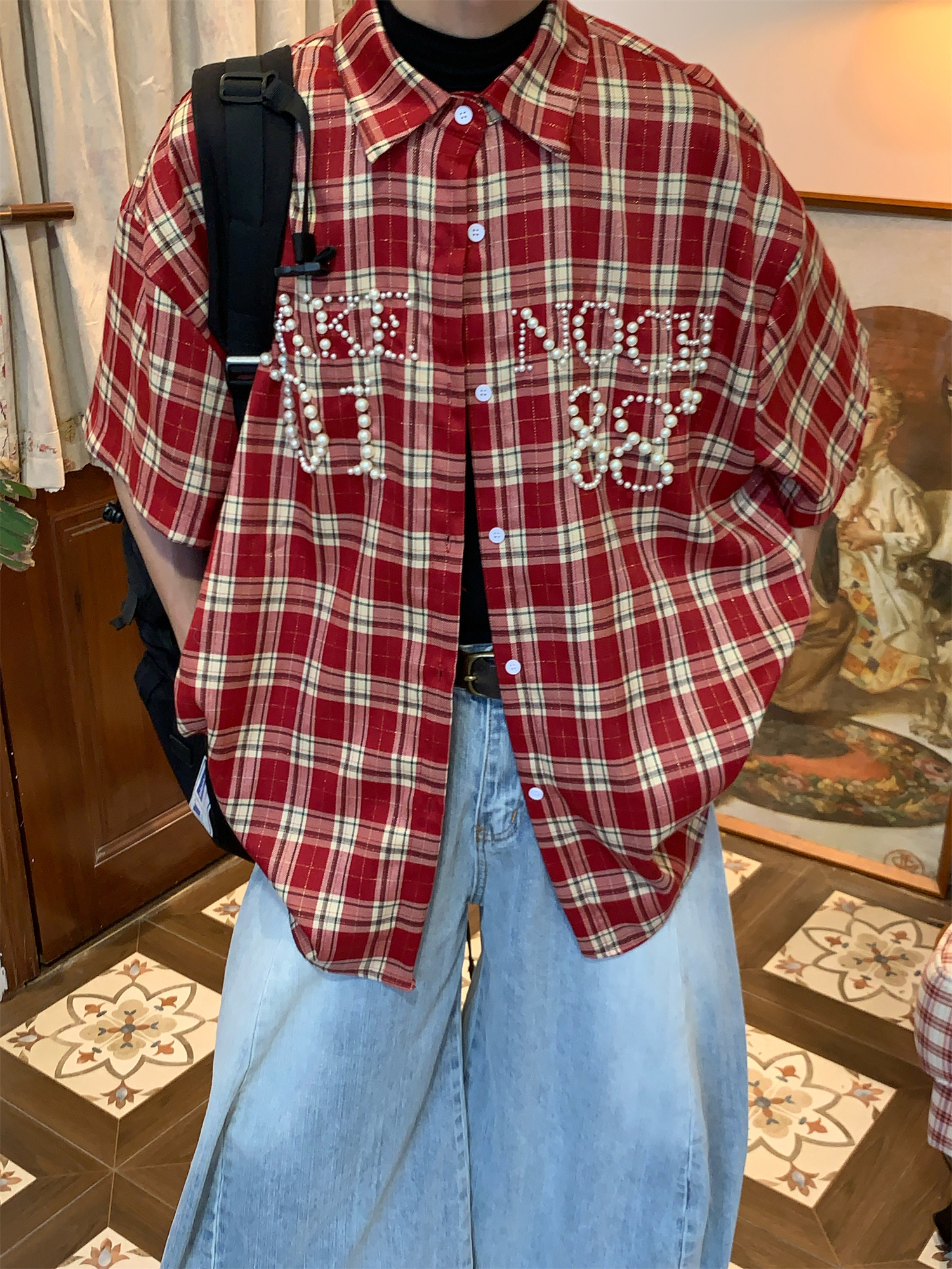 Beaded Plaid Shirt Men, Women, Summer Loose Fit Couple Streetwear, Vintage Pearl, pired High-quality product featuring prom dresses, spring outfits, business casual outfits and more. Modern design that fits the latest trends. Premium materials ensure durability and comfort. Order now for special offers! Product designed with attention to every detail. Suitable for all occasions and personal styles.