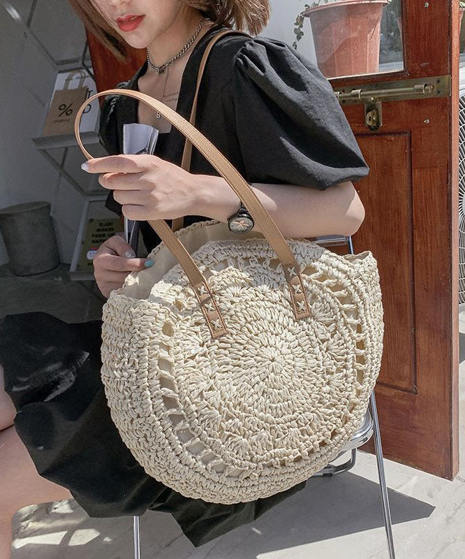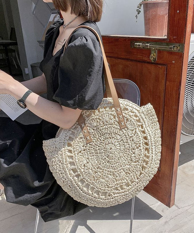 Beige Beach Satchel Handbag Straw Woven Hollow Out