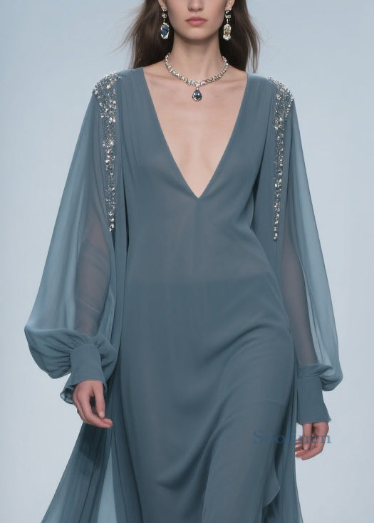 Blue Original Design Solid Chiffon Dress V Neck Lantern Sleeve