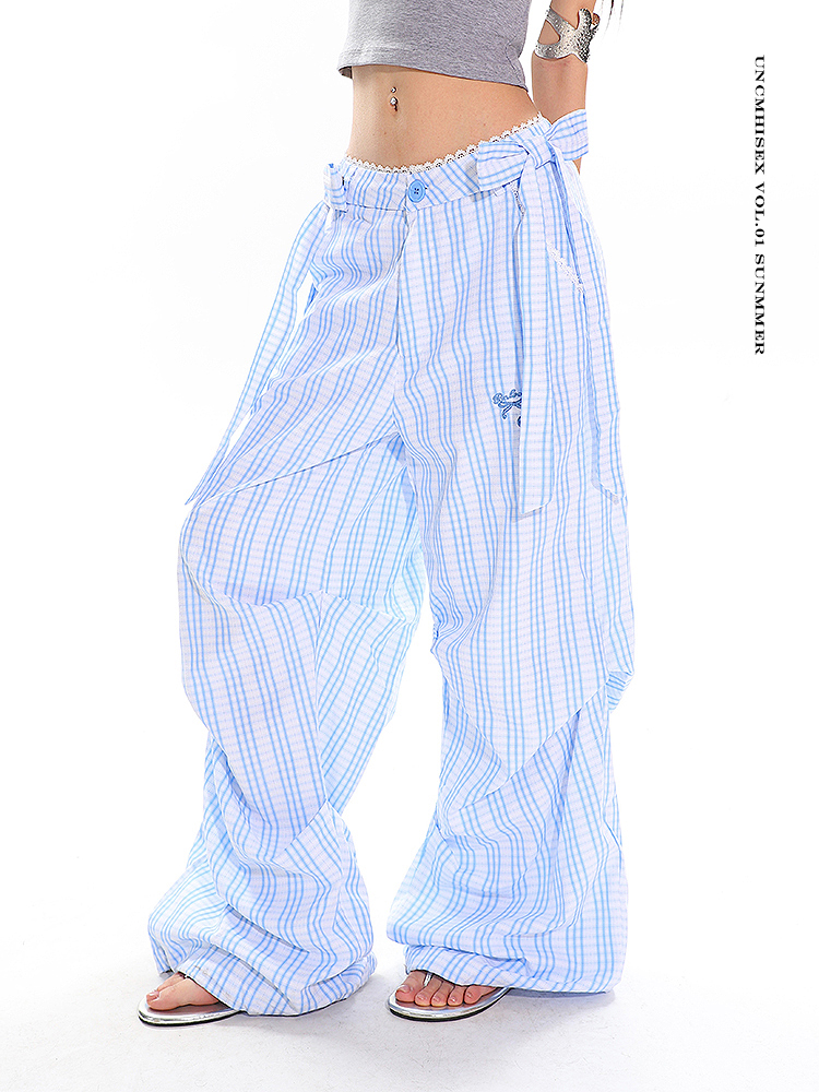 Elevate your summer wardrobe with our Blue Striped Bow Casual Wide-Leg Pants, expertly crafted for a chic yet relaxed fit. Featuring a unique spliced lace design and a trendy 90s inspired straight-leg style, these pants offer both comfort and a contemporary edge. Perfect for any casual outing, they effortlessly pair with your favorite tops and sandals. Don’t miss out on this stylish addition to your collection—add to your cart today!
