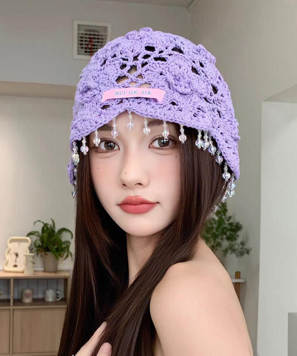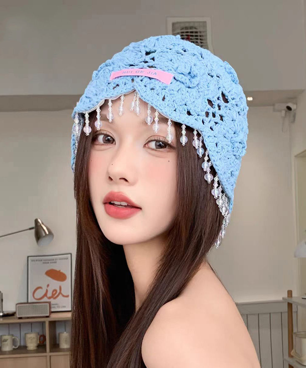 Bohemian Blue Floral Tassel Hollow Out Knit Boonie Hat
