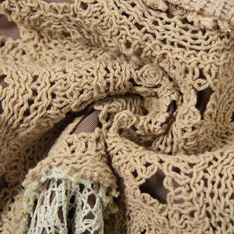 Layered crochet, contrast textures, and an asymmetric hem, this boho mini skirt blends art and edge. With a stretchy waistband and draped net overlay, it’s made for earthy streetwear looks, barefoot beach days, or pairing with slouchy boots and off-shoulder tops.