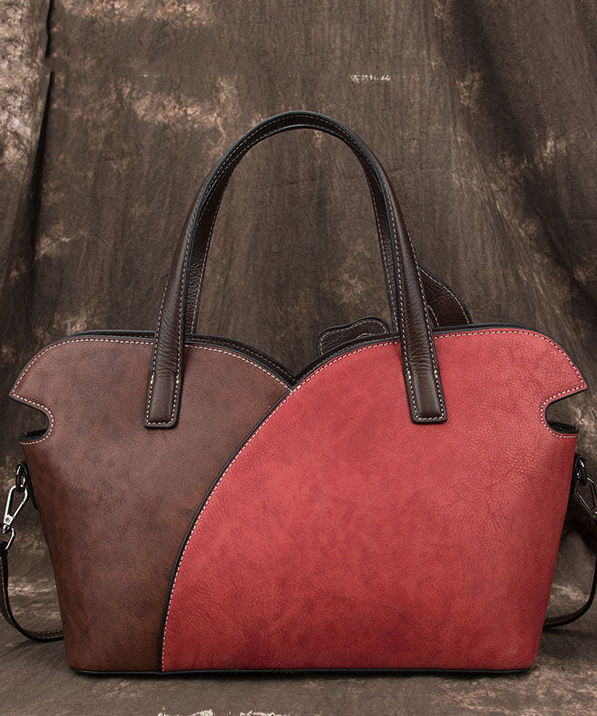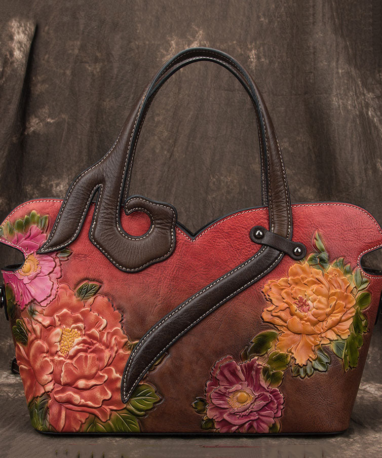 Boho Red Chrysanthemum Jacquard Patchwork Calf Leather Tote Handbag