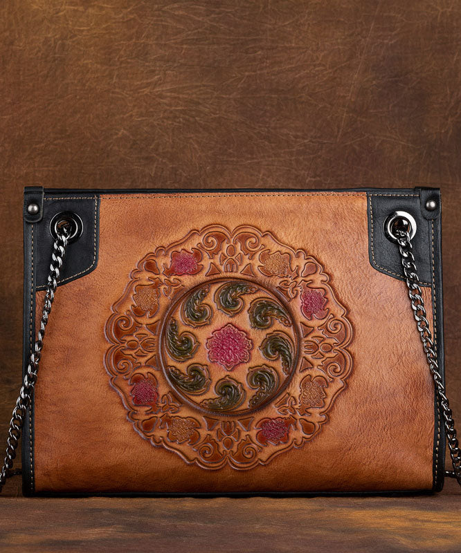 Boho Yellow Embossing Paitings Calf Leather Satchel Handbag