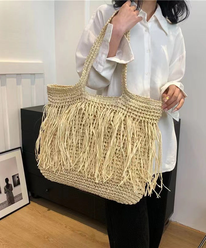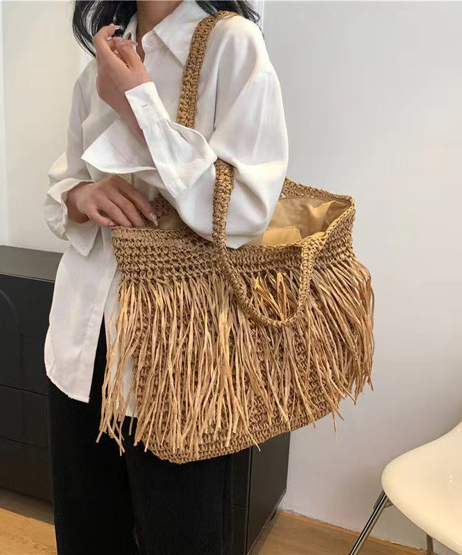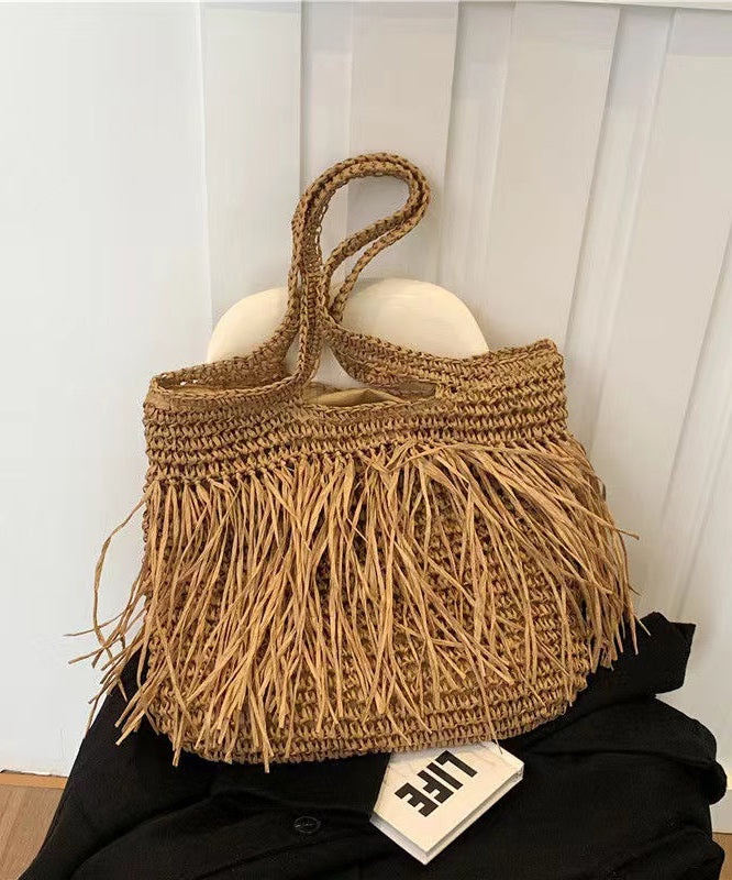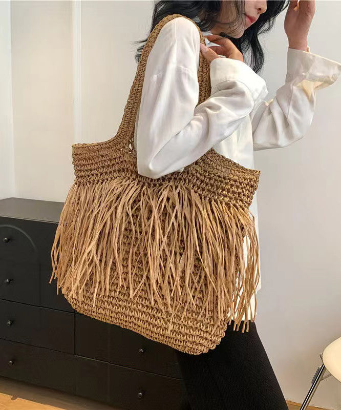 Boutique Khaki Handmade Straw Woven Tassel Shoulder Bag