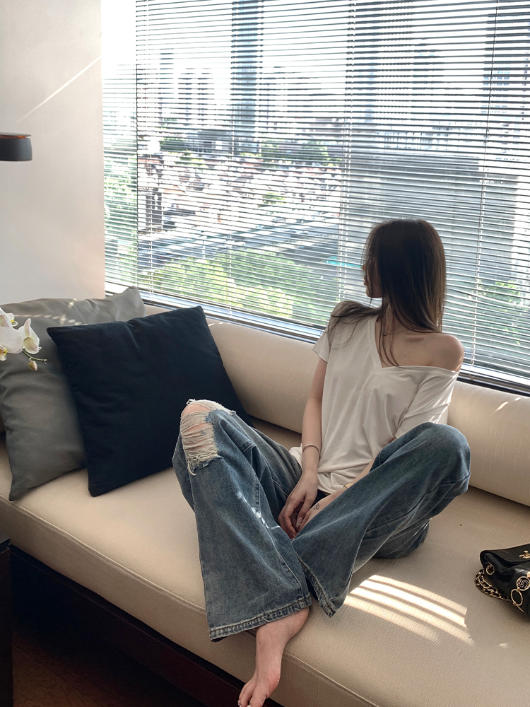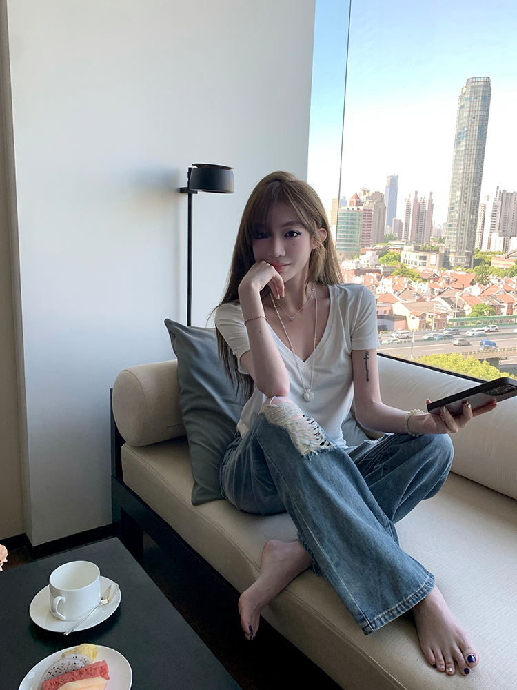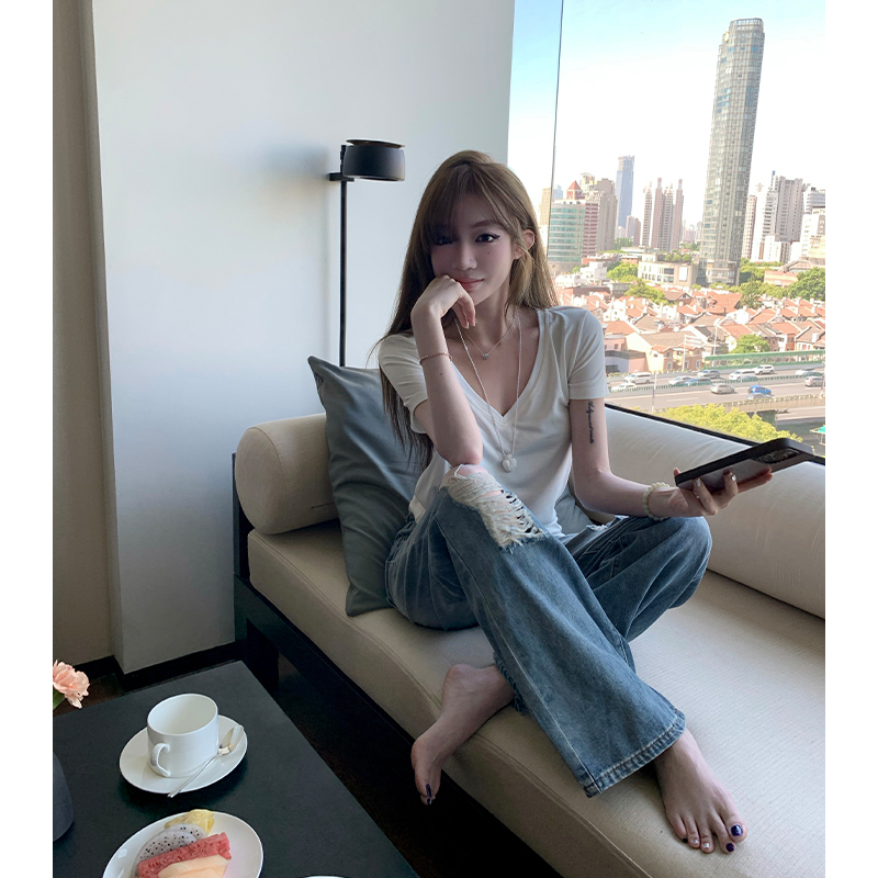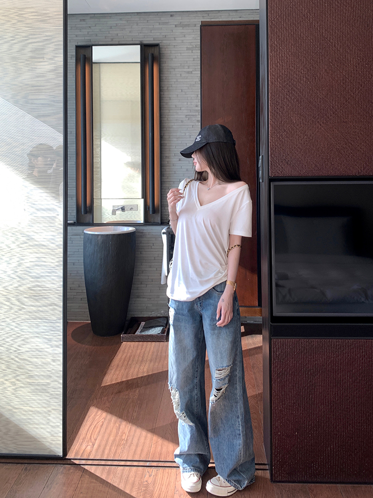 Cool V- Neck Short Sleeve Women Loose Slim Fit White Top, Ca – Outfit Ideas