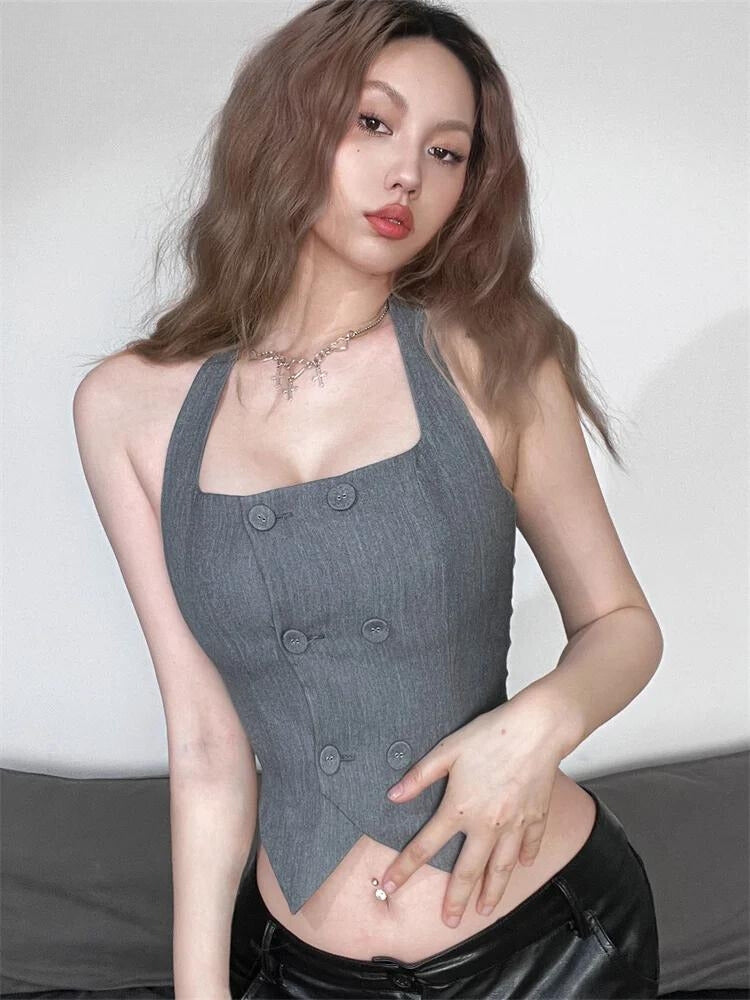 Discover the perfect fusion of edgy and delicate with this one-of-a-kind halter top. Its distinctive asymmetrical closure captivates, while the tailored cut accentuates. Ideal for an eclectic style statement.