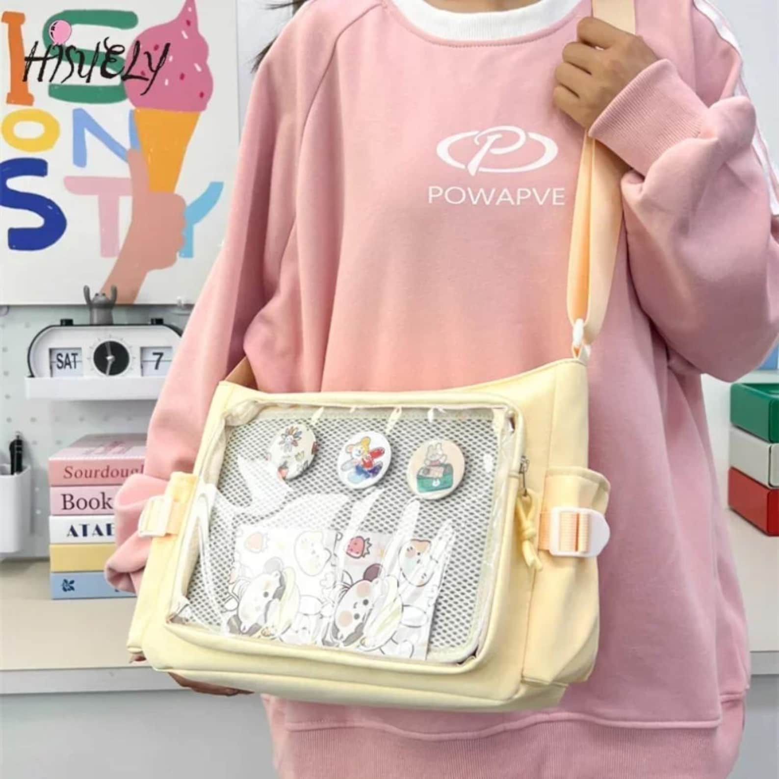 This Preppy Style Candy Colour Ita Bag is the perfect accessory for women, girls, and anime lovers. Designed with a transparent badge display pocket, it’s ideal for showcasing your pins, charms, or plush keychains, while carrying all your daily essentials.