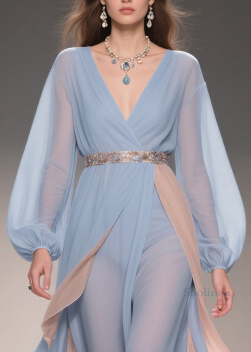Chic Blue Asymmetrical High Waist Patchwork Chiffon Party Dress