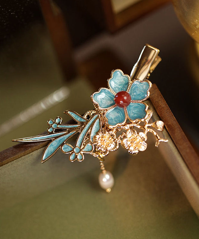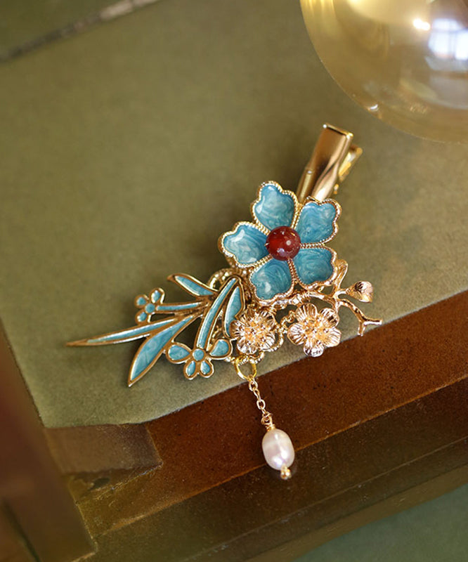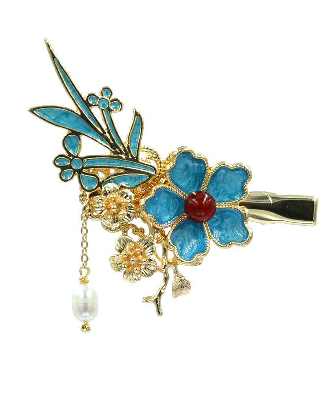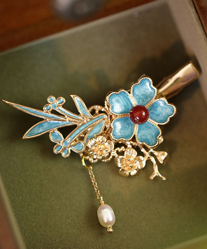 Chinese Style Blue Sterling Silver Overgild Pearl Floral Tassel Hairpin