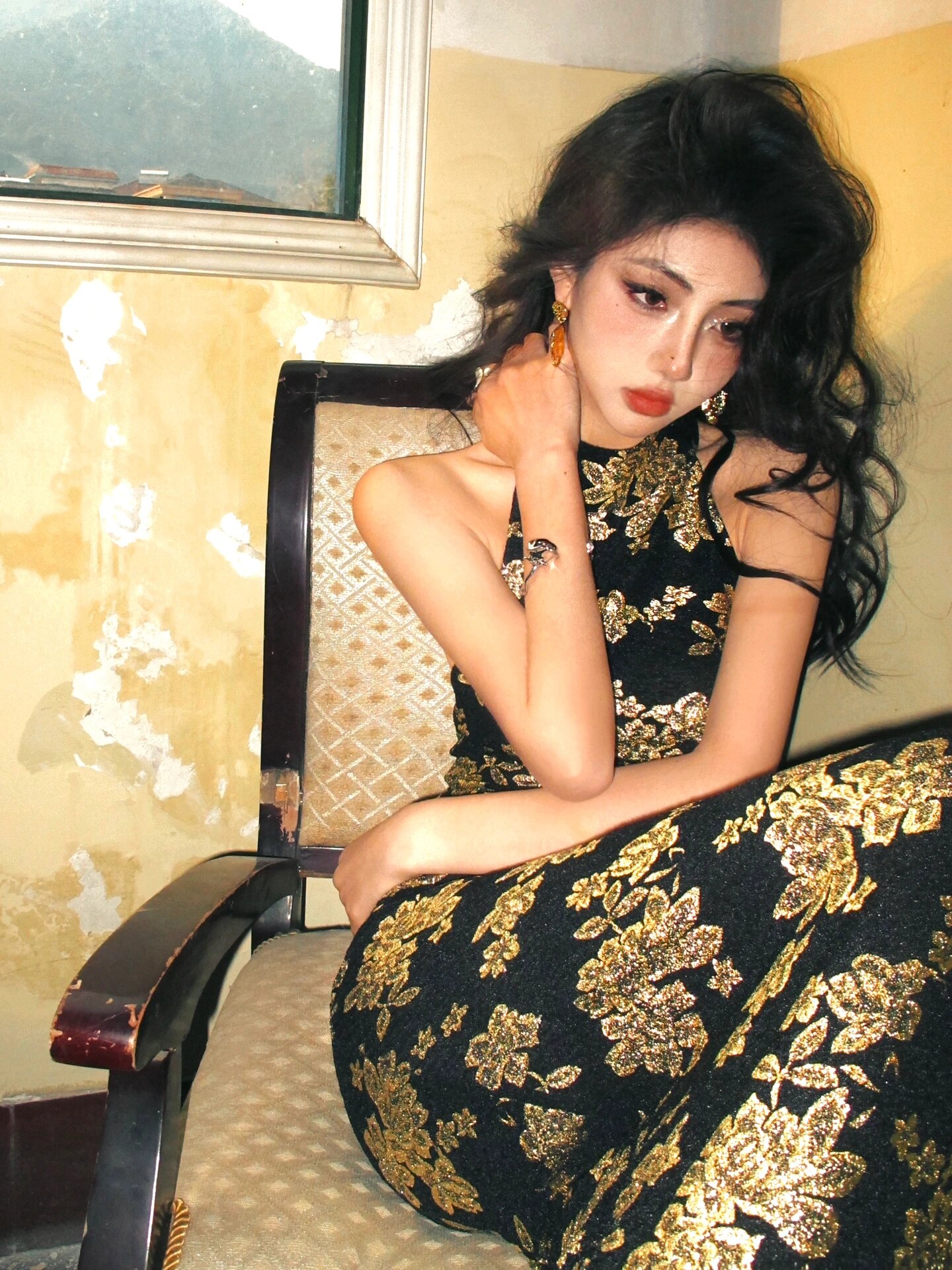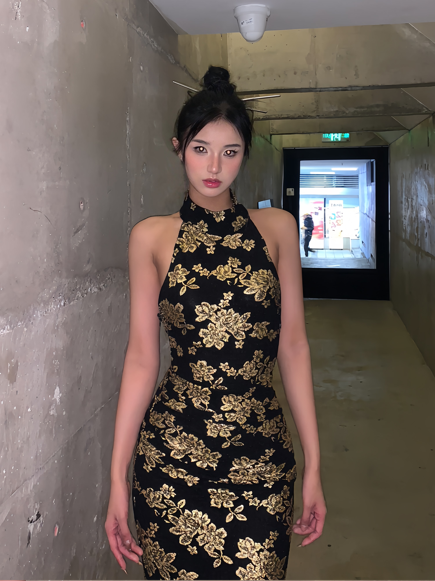 Elegant Gold Foil Halter Neck Evening Dress: Stunning Outfit – Outfit Ideas