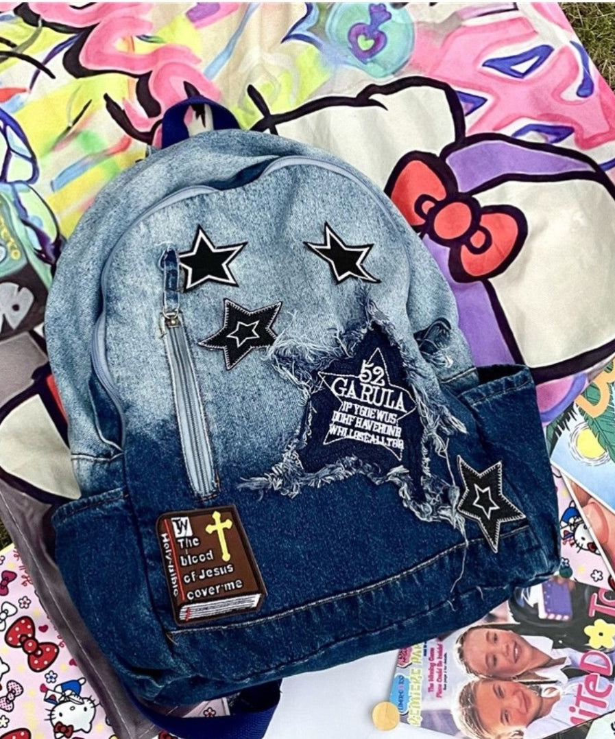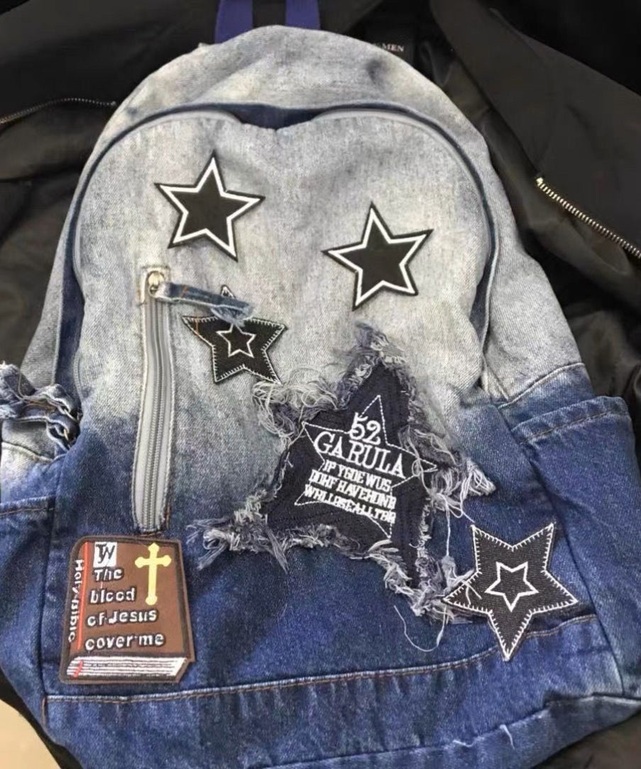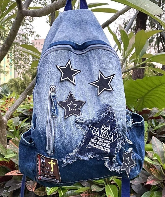 Classic Gradient Blue Denim Patch Large Capacity Backpack Bag