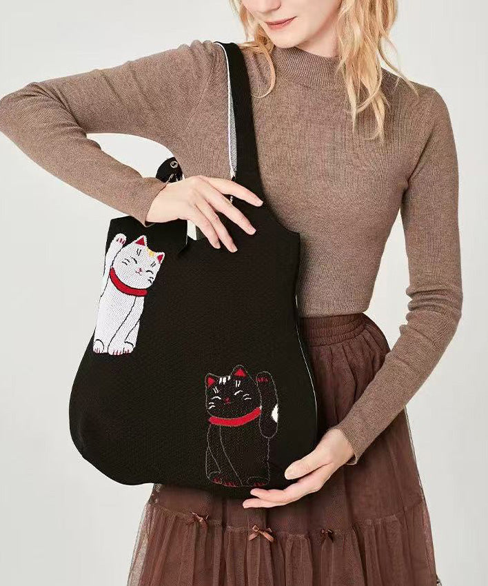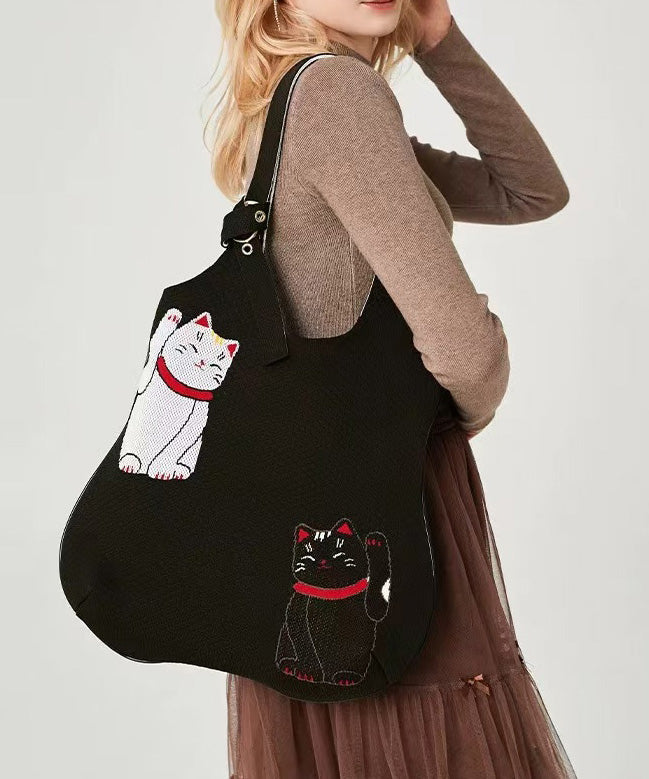 Classy Black Cat Embroidered Solid Durable Cotton Shoulder Bags