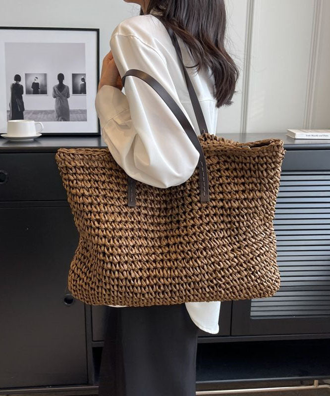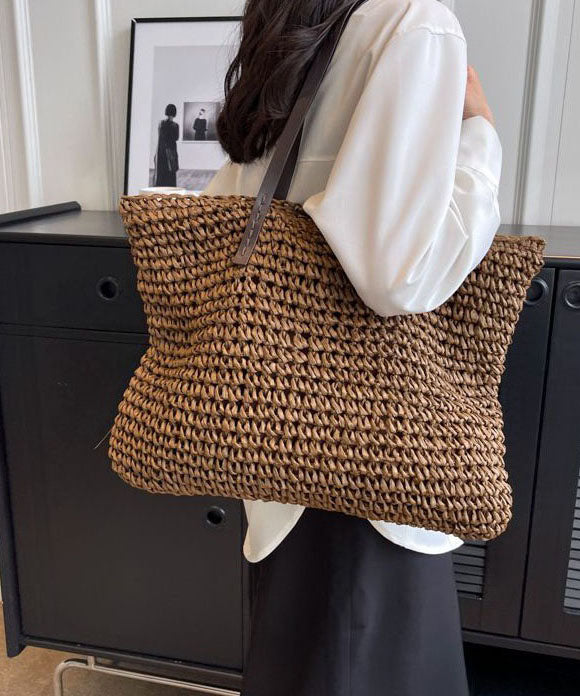 Coffee Straw Woven Satchel Bag Handbagdbag Patchwork Zip Up