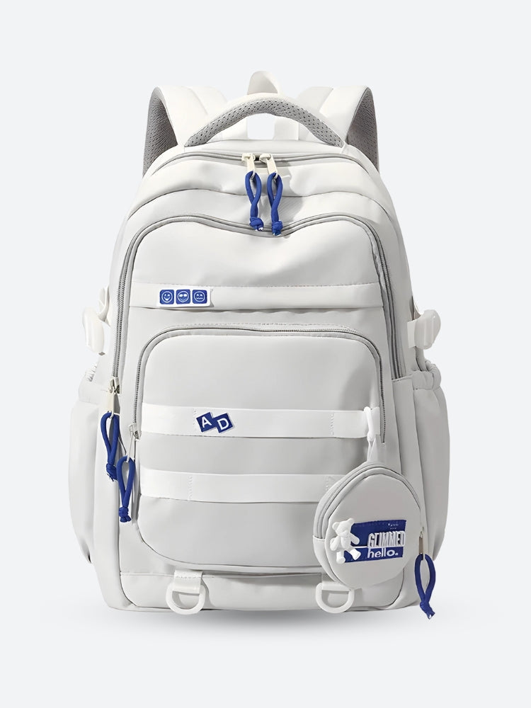 A large school backpack in a soft pink hue, paired with a detachable coin purse, providing ample storage and organization for school essentials. Designed for comfort and style, this versatile backpack is perfect for everyday use.