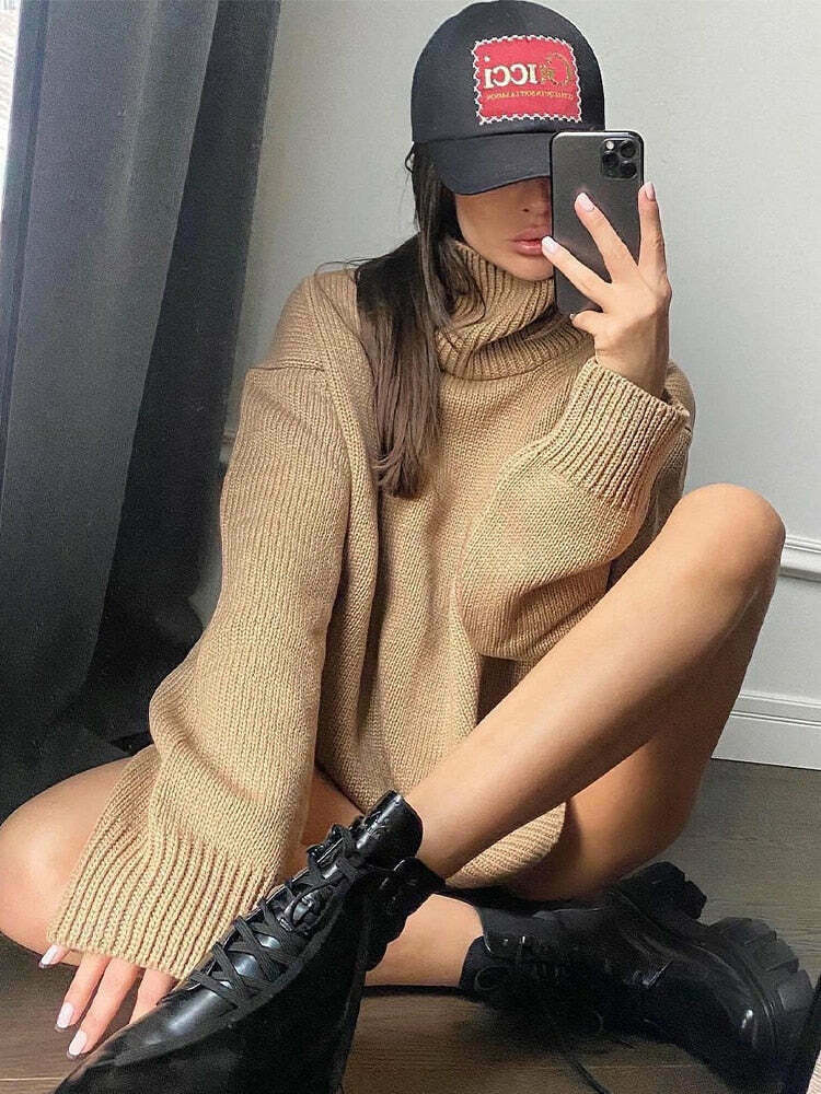 A warm-knitted oversized turtleneck jumper that can also be worn as a short dress- Make it your wardrobe staple until sunshine returns.