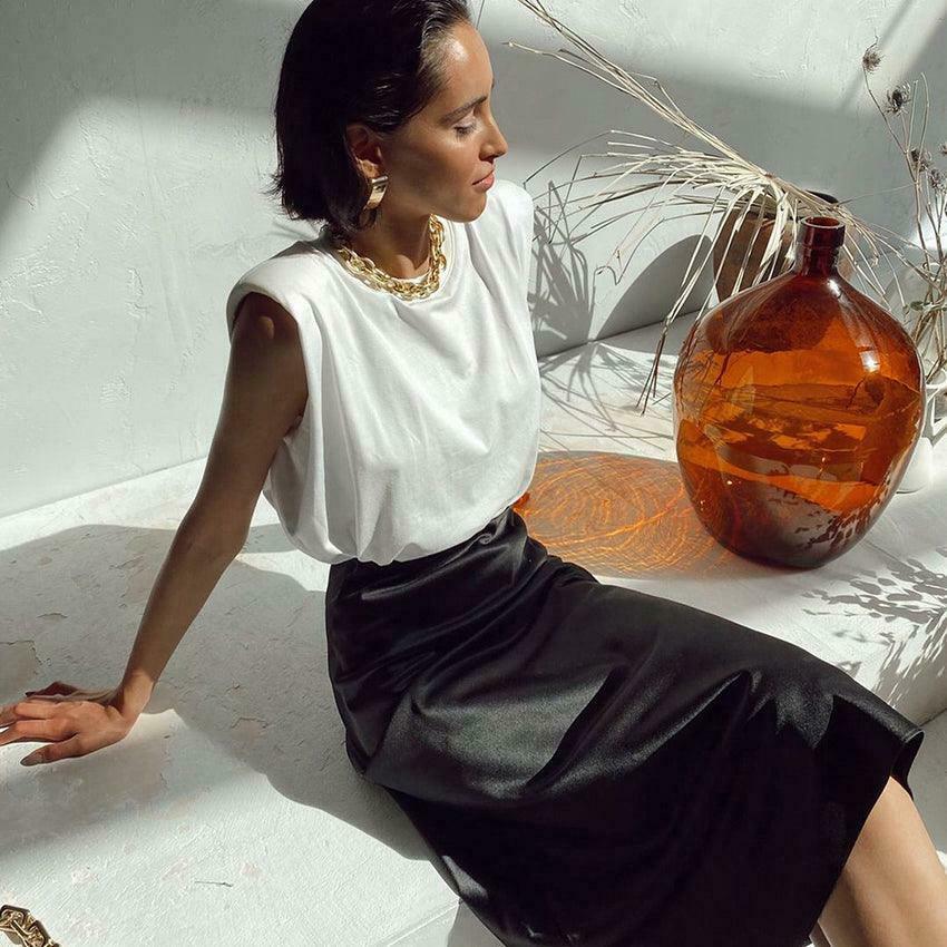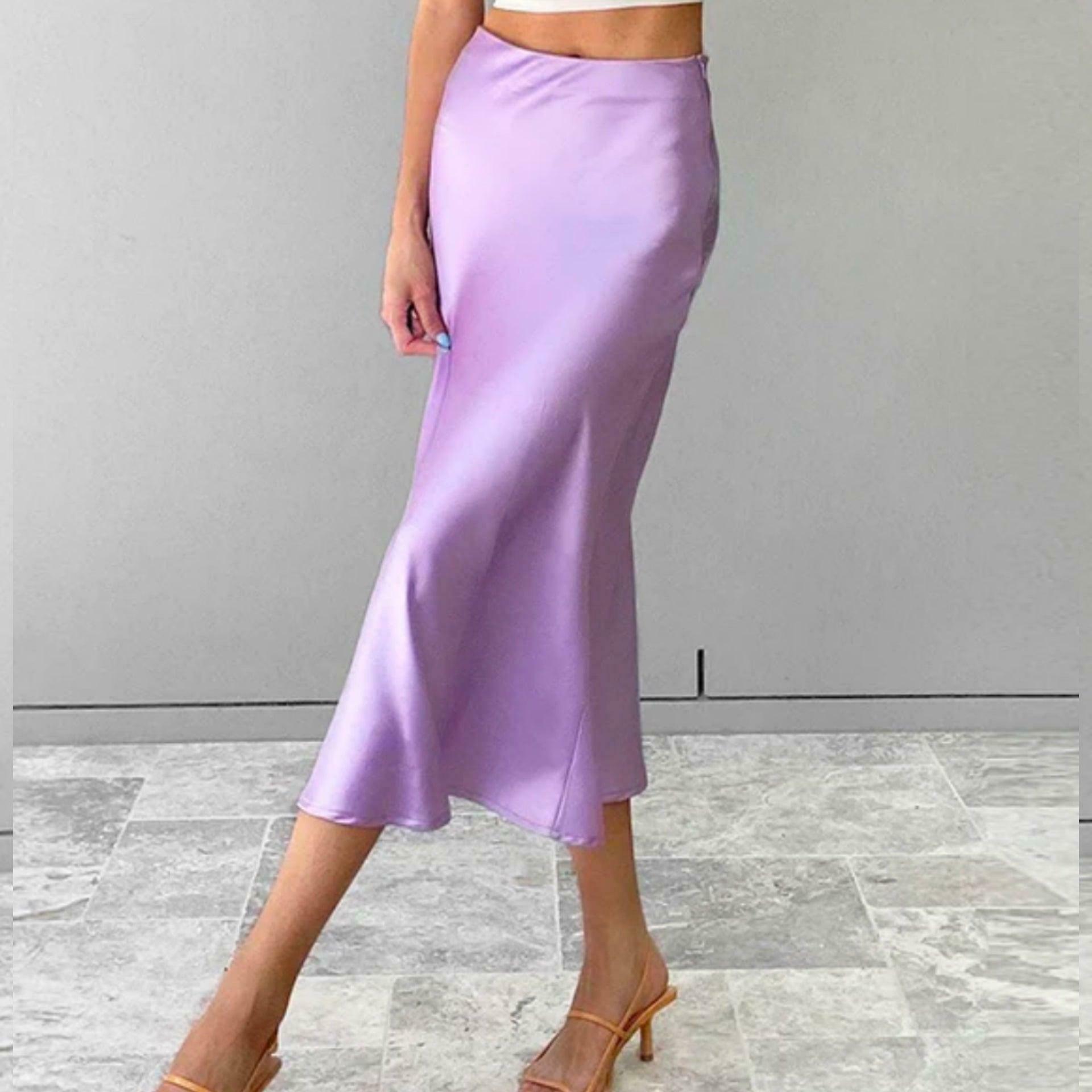 Satin midi skirts are great for every occasion. Pretty pastels and classic ditsy florals can be toughened up by teaming them with a plain tee, leather jacket, and boots.