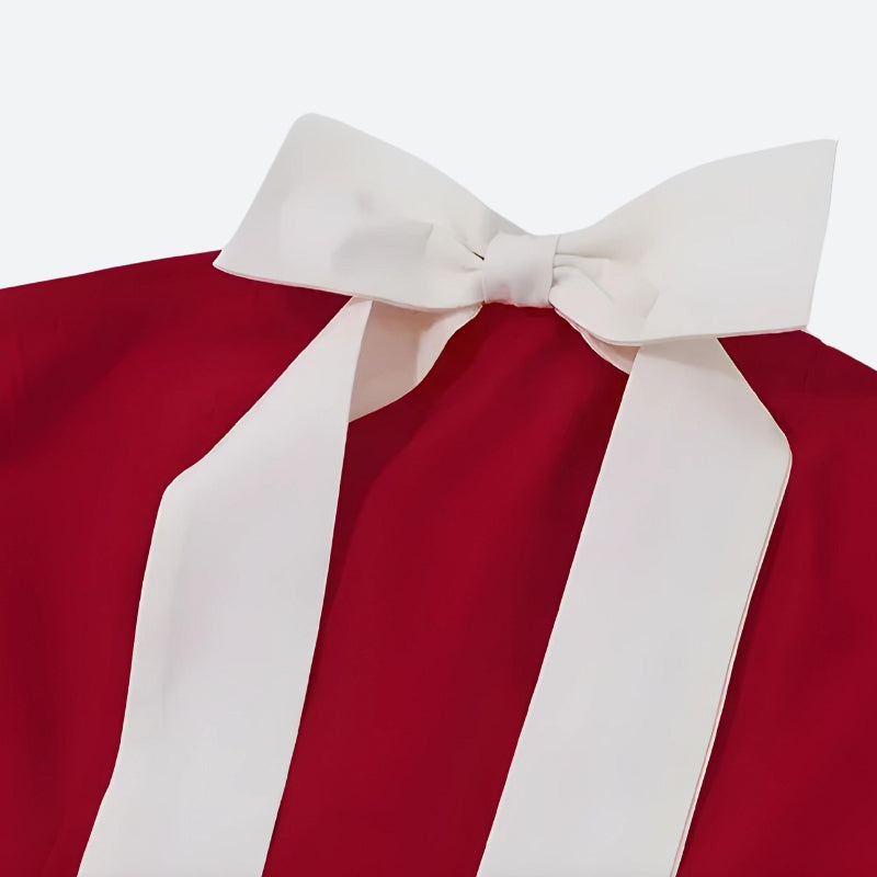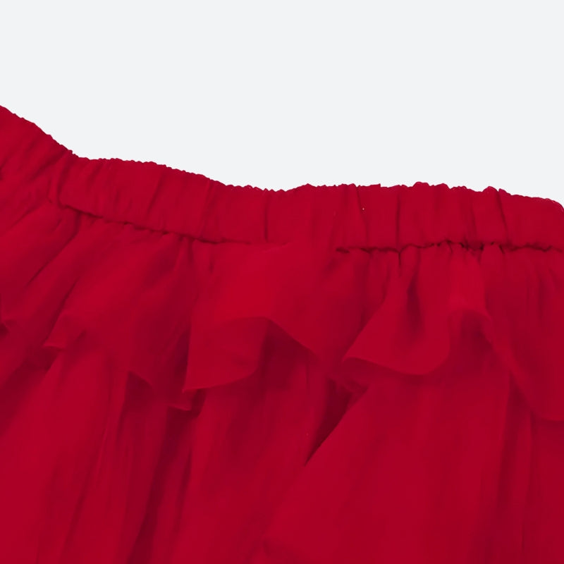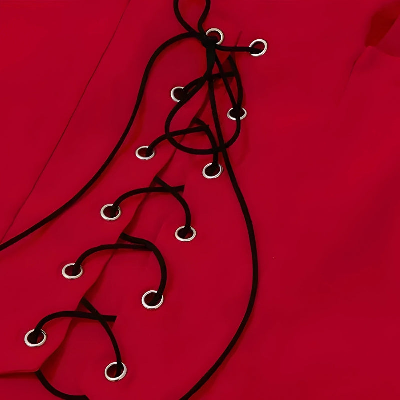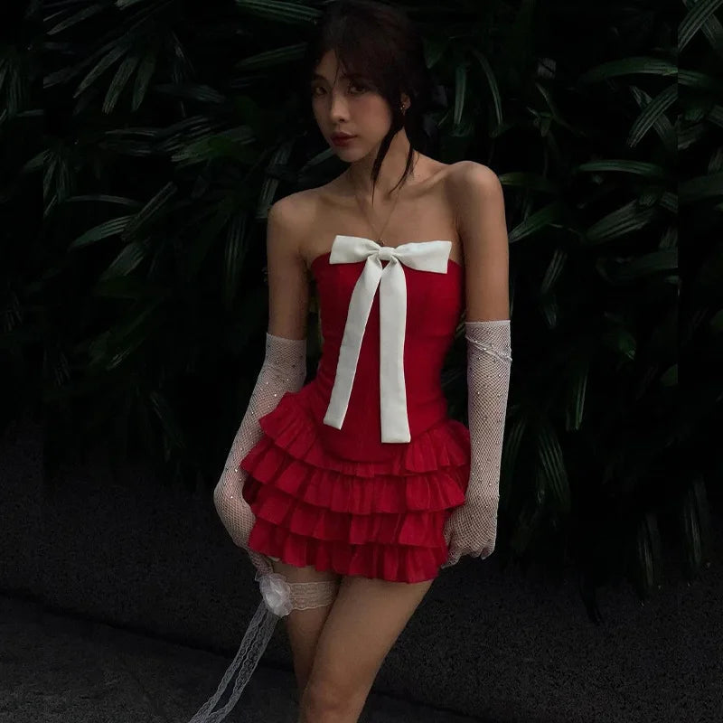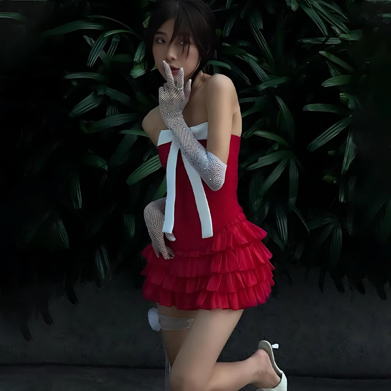 Dressed in vibrant red and accented with a striking white bow, this ensemble exudes charm and flirtatiousness. The corset top enhances your silhouette, while the layered ruffled mini skirt adds a whimsical touch. Perfect for a romantic evening out or a special occasion, this set pairs beautifully with delicate accessories to create a captivating, eye-catching look.