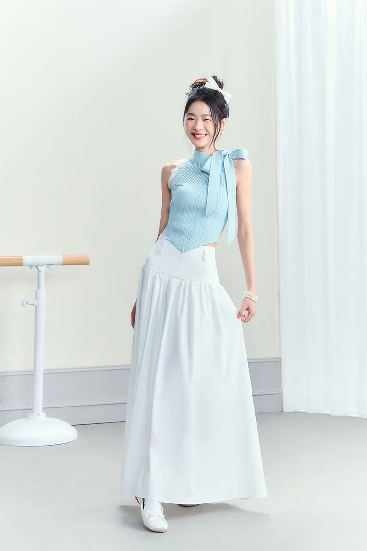 This coquette knitted top with a sweet bow tie detail exudes youthful flair for any occasion. The delicately ribbed texture and flattering cut highlight a feminine look. It pairs well with skirts or jeans for day or night.