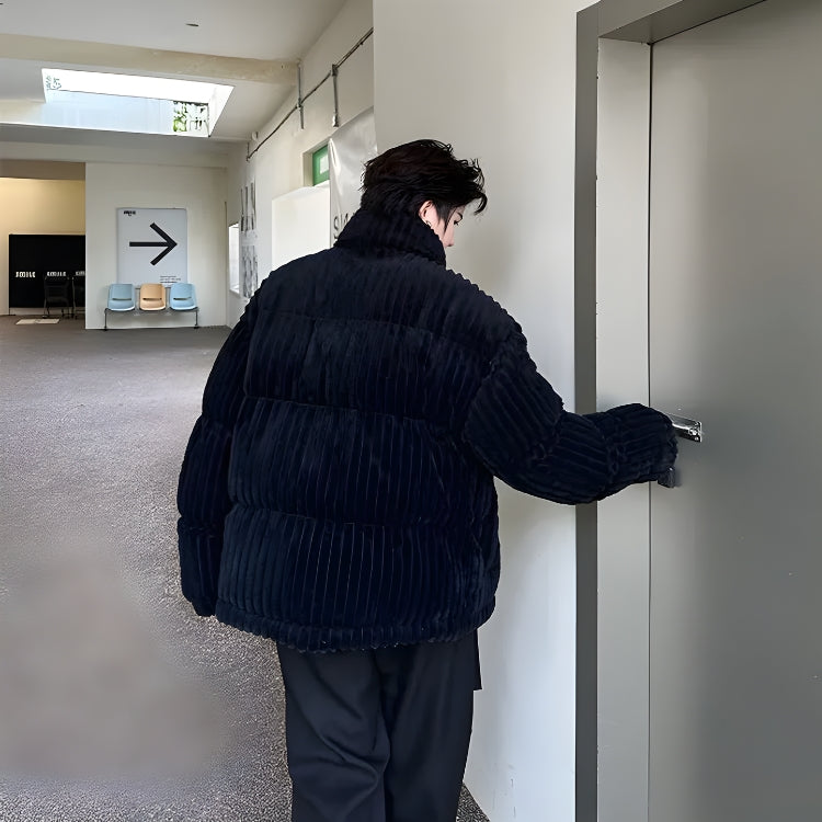 Stay warm and stylish with this corduroy and ribbed puffer jacket. Featuring long sleeves, a button fastening, and two front pockets, it’s the epitome of winter comfort. Ideal for men who prefer a blend of casual, streetwear, and comfy styles with a soft touch.