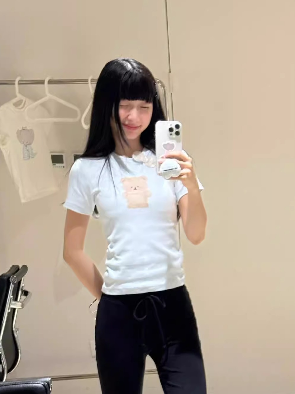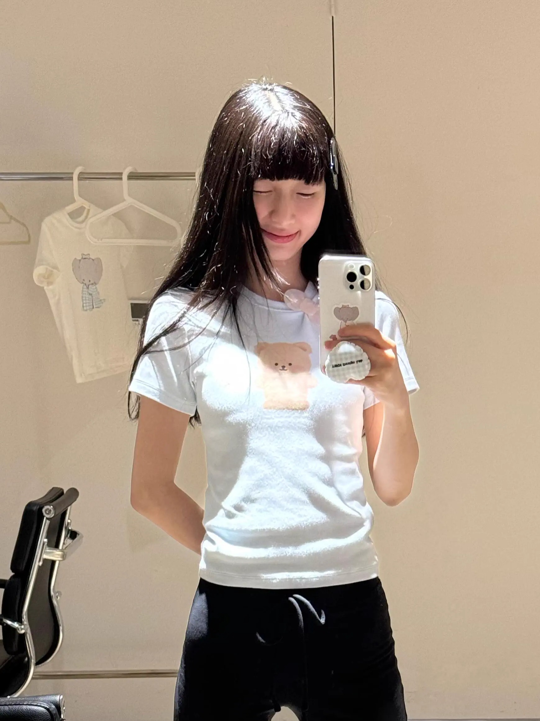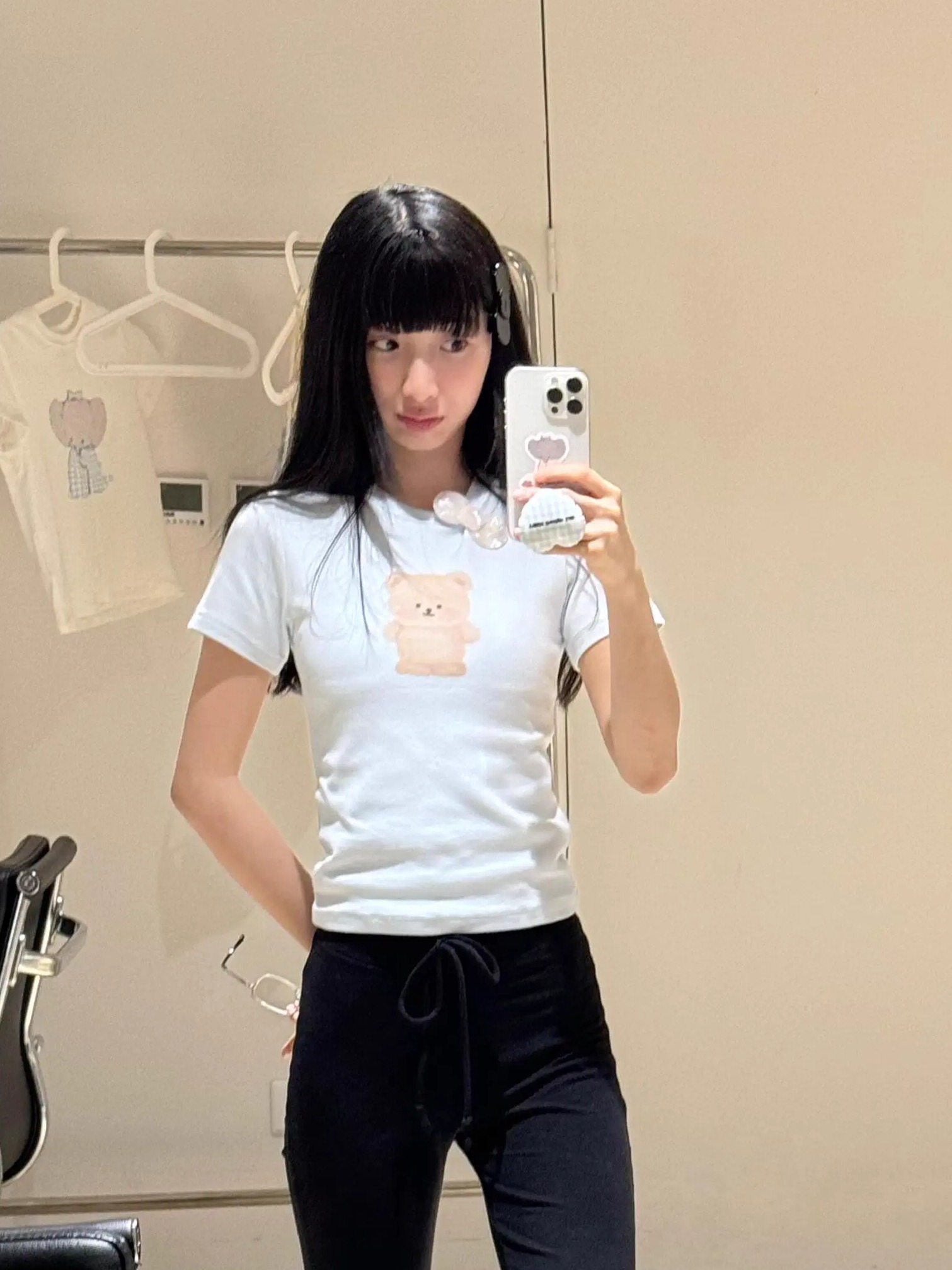 Cute Bear Print Short Fitted Slim Pure Cotton High Stretch Short Sleeve Korean High-quality product featuring prom dresses, spring outfits, business casual outfits and more. Modern design that fits the latest trends. Premium materials ensure durability and comfort. Order now for special offers! Product designed with attention to every detail. Suitable for all occasions and personal styles.