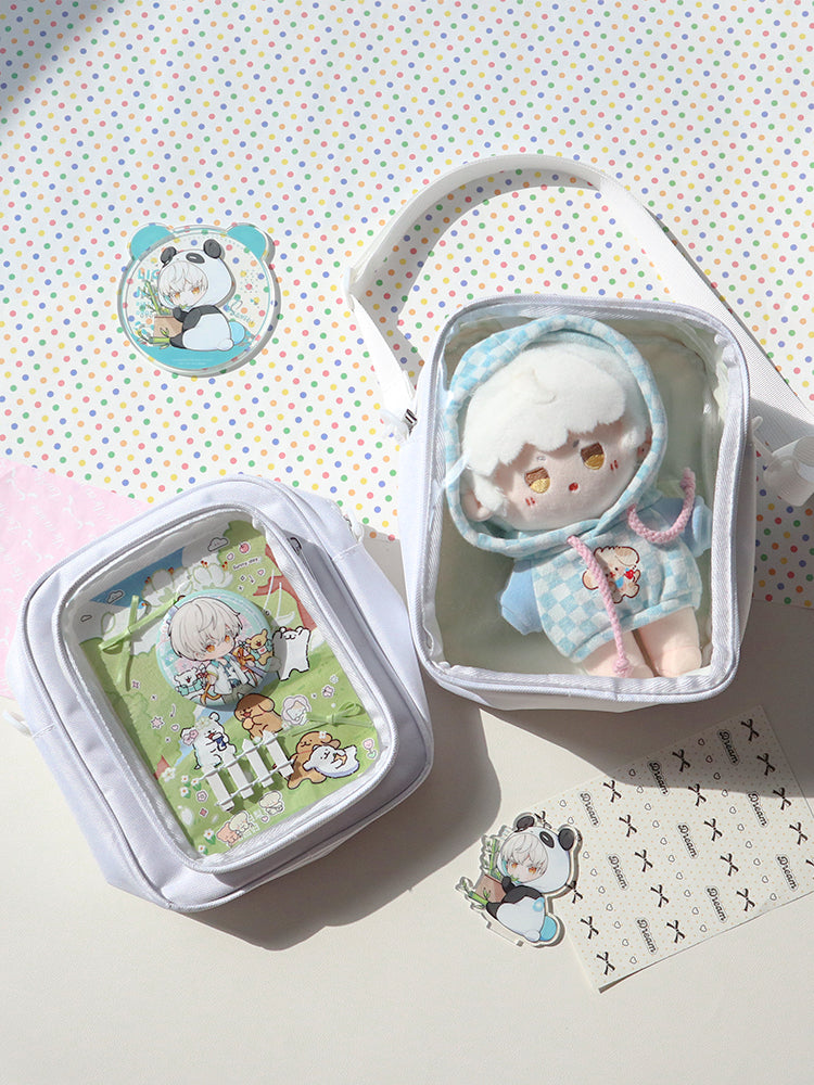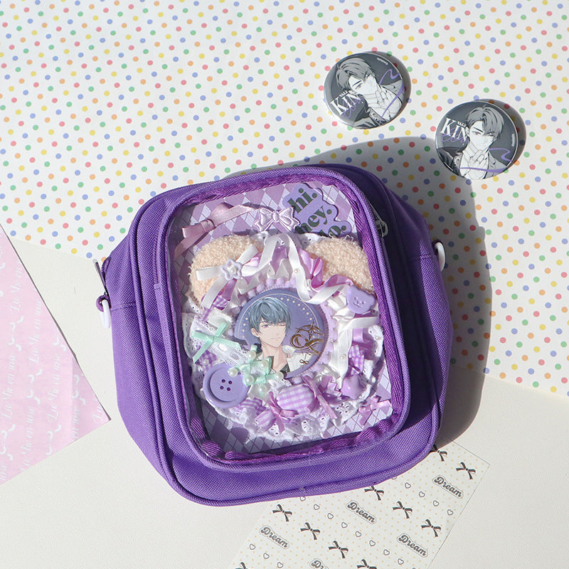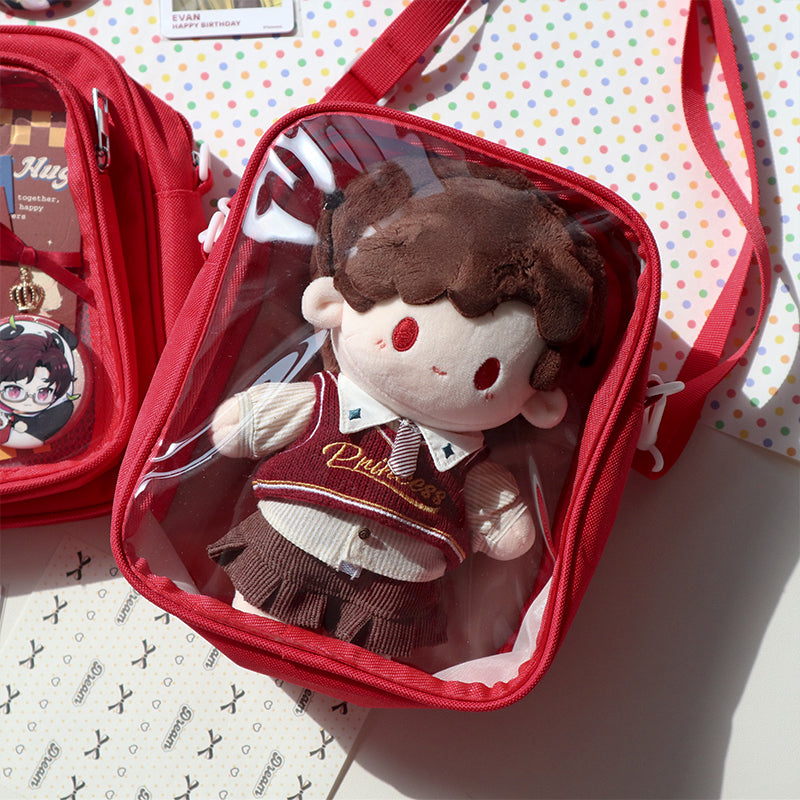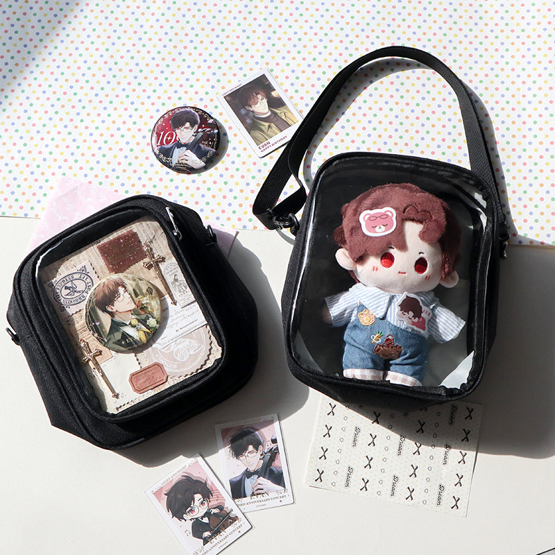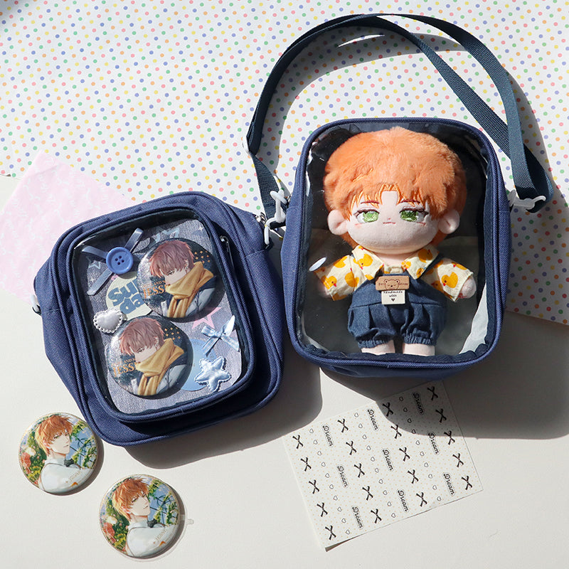 This bag is available in two versions: Ita Bag Version and Doll Ita Bag 2-in-1 Version. The Ita Bag Version features a single display window, ideal for holding cards, pins, badges, and other small items. The 2-in-1 Doll Ita Bag Version includes two display windows (front and back), allowing it to function both as a doll bag and an ita bag.
