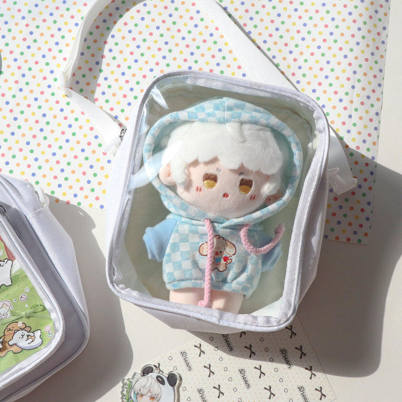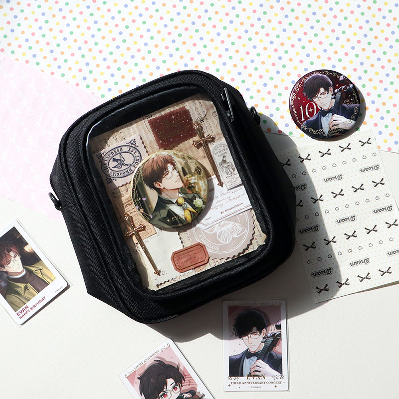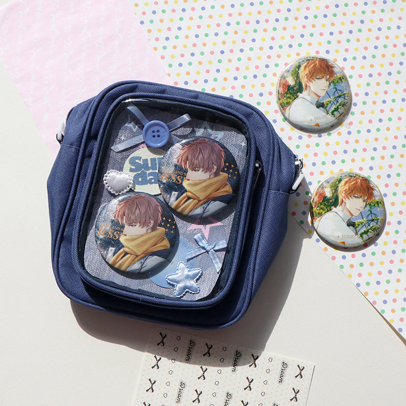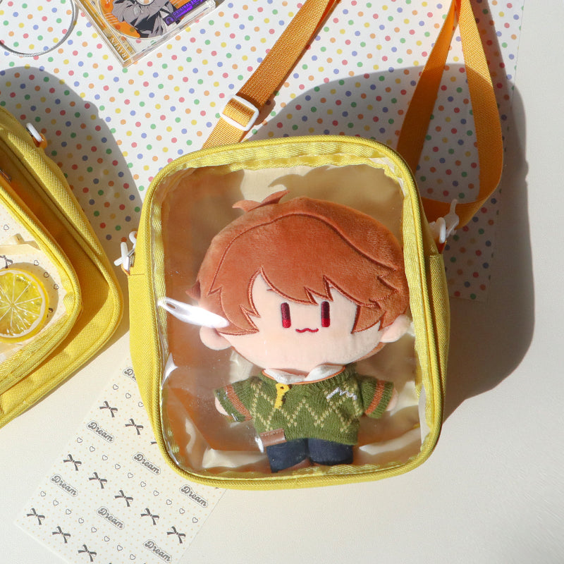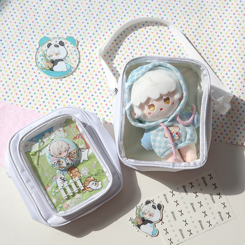 This bag is available in two versions: Ita Bag Version and Doll Ita Bag 2-in-1 Version. The Ita Bag Version features a single display window, ideal for holding cards, pins, badges, and other small items. The 2-in-1 Doll Ita Bag Version includes two display windows (front and back), allowing it to function both as a doll bag and an ita bag.