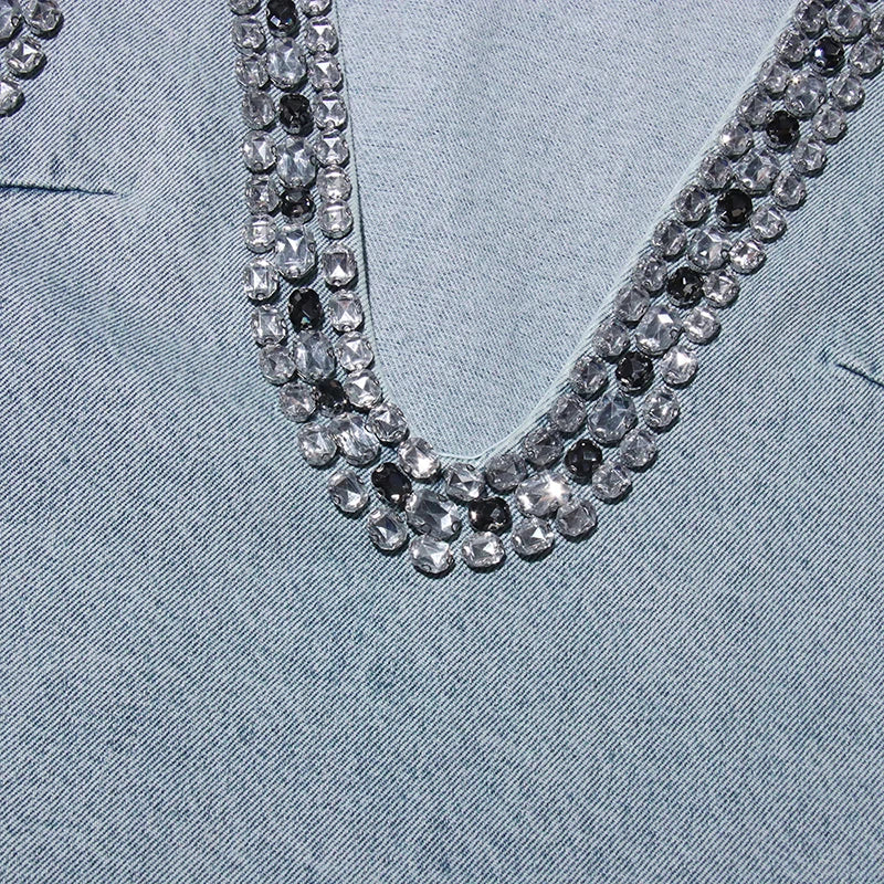 Bold and daring, this denim mini dress brings street style to life with its deep plunging neckline and sparkling jewel trim. Designed to catch the light and attention, the sleeveless cut gives it a sleek edge. Perfect for nights out or styled casually with boots, it’s a versatile piece with a statement finish.