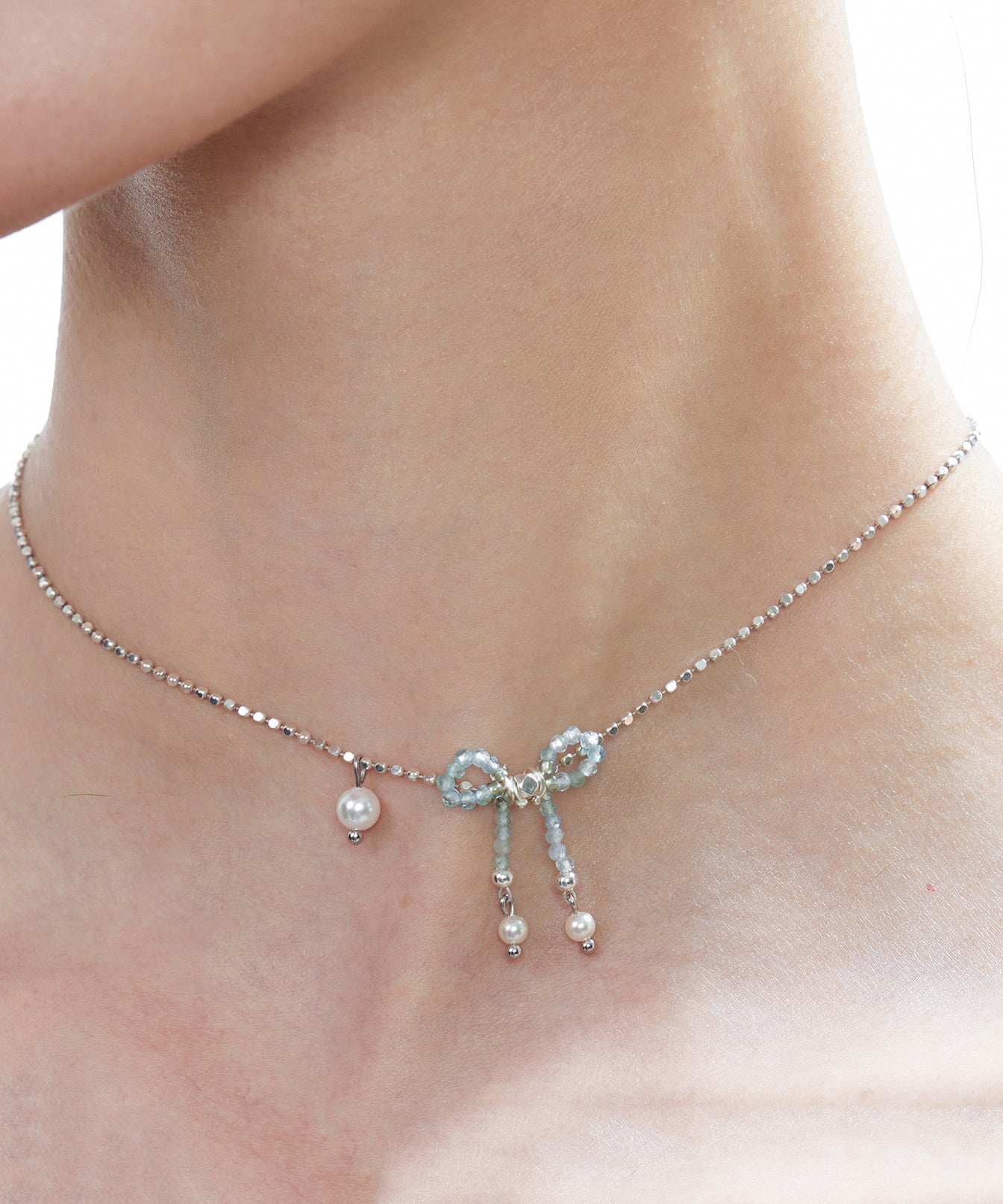 Elegant Blue Crystal Bow Pearl Silver Choker