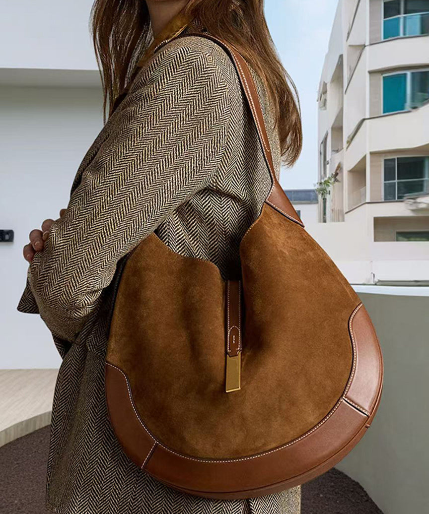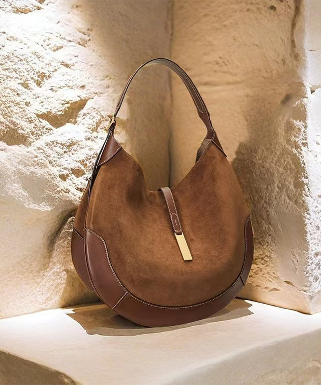 Elegant Brown Patchwork Solid Durable Fine Suede Saddle Bag