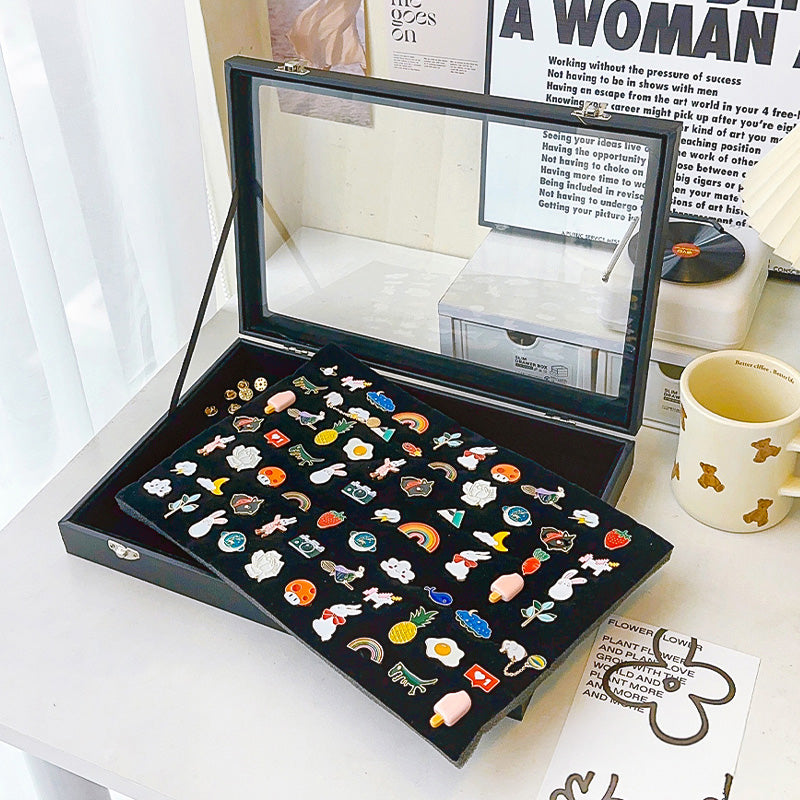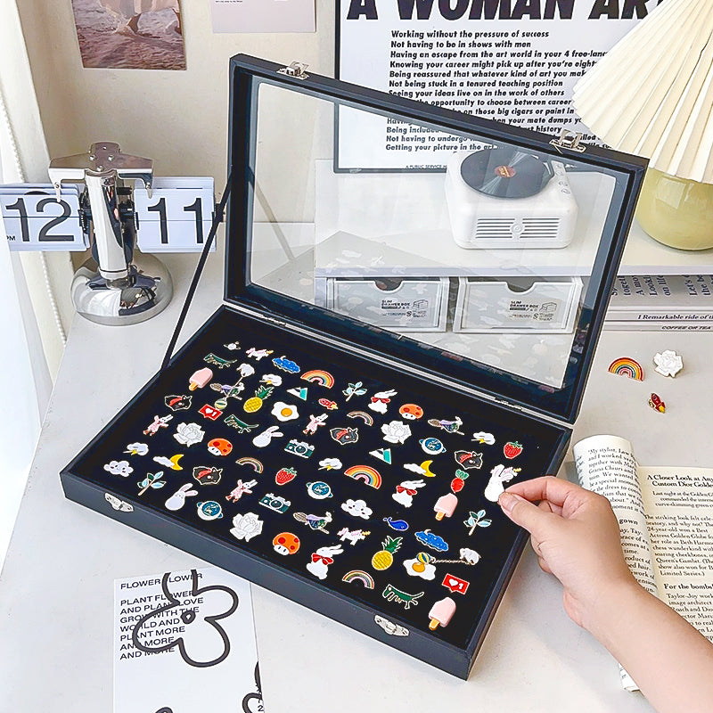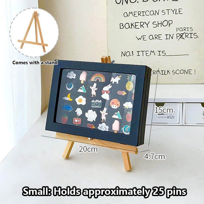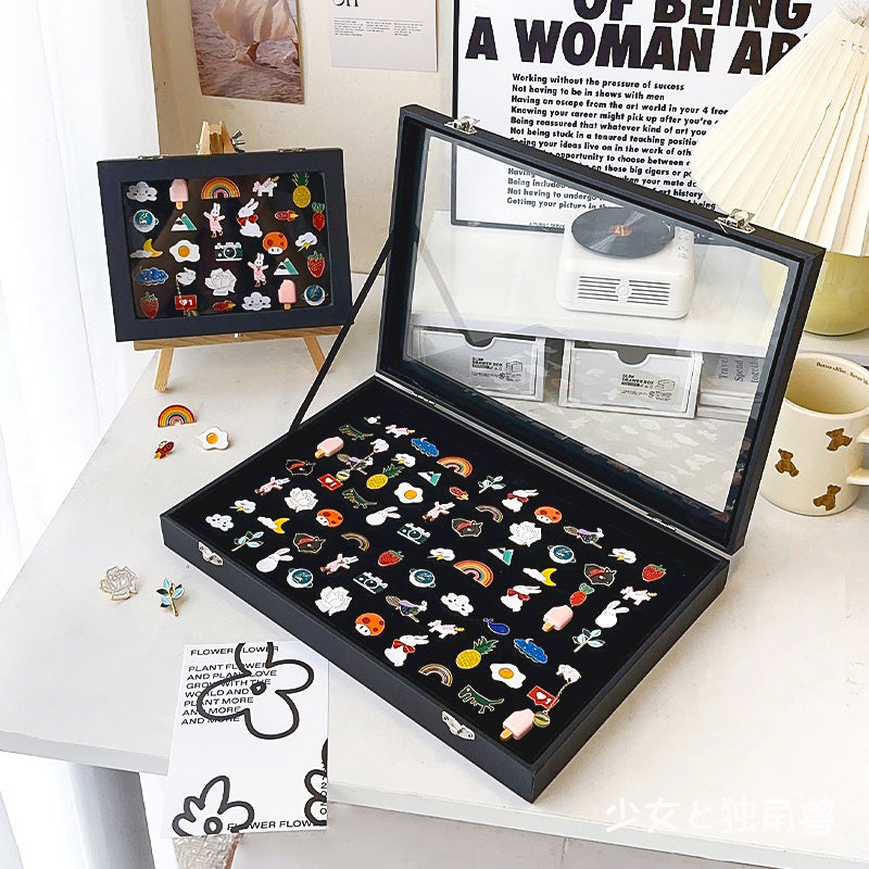 Enamel Pin Storage Display Box – Available in various sizes to meet different needs. Sealed and dustproof, it is resistant to oxidation and comes with a stand for both storage and display.