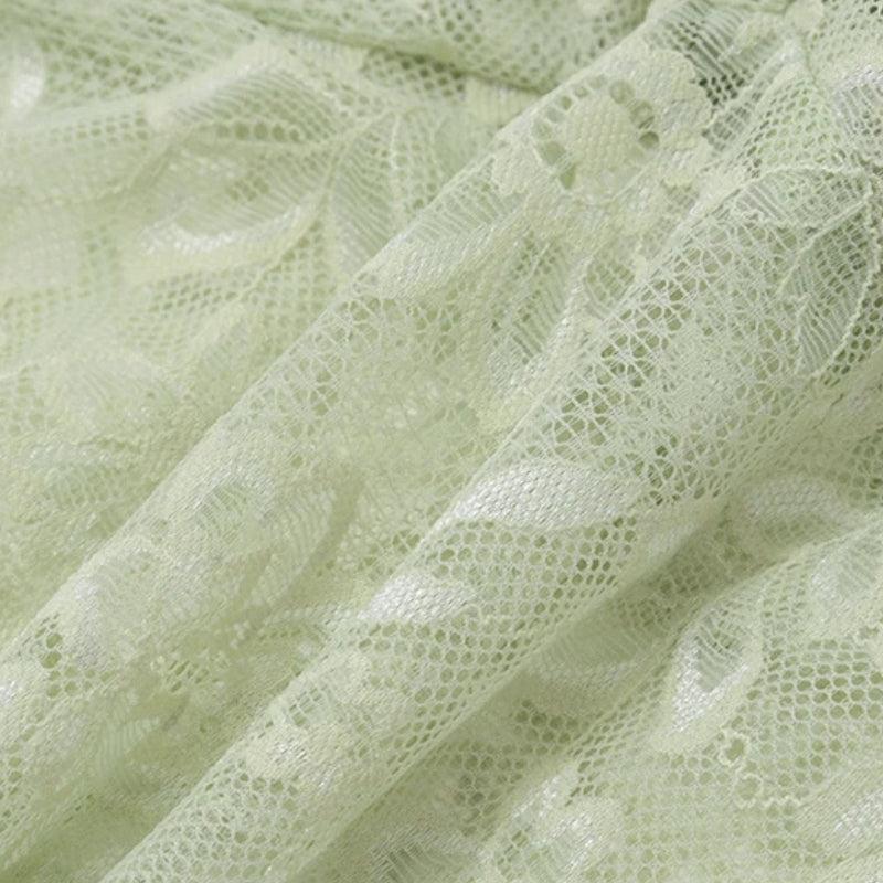 Sheer lace, soft green, and a halter scarf detail. This lace halter top brings all the dreamy energy to your summer lineup. Lightweight, fitted, fairycore and flirty.
