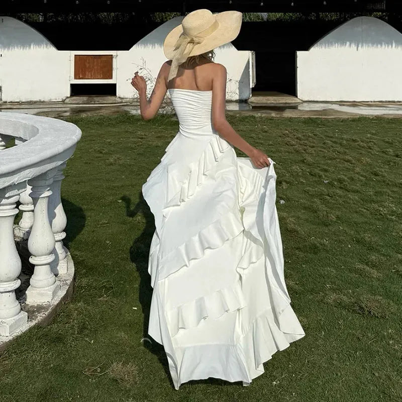 Whimsical, flirty, and floaty—this strapless white dress channels fairycore energy with cascading ruffles and a dramatic high-low hem. Perfect for barefoot garden strolls or dreamy summer dates, it’s all about soft silhouettes with a bold twist.