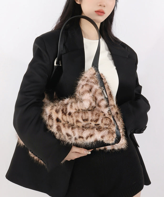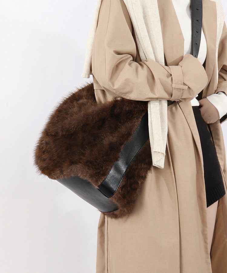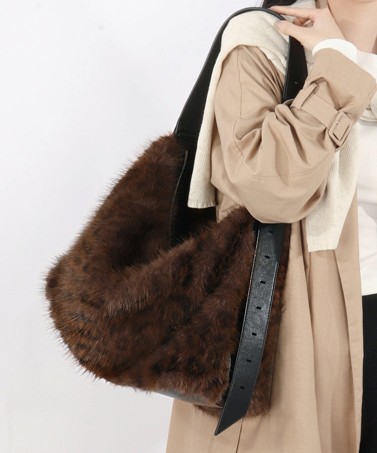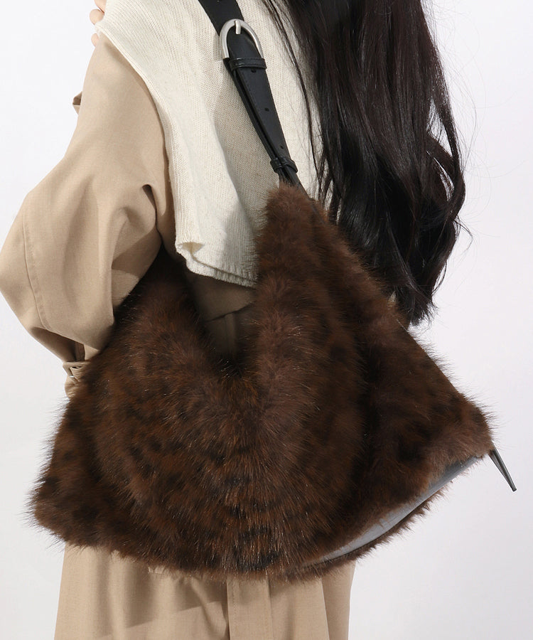 Fashion Coffee Leopard Large Capacity Fuzzy Fur Satchel Bag Handbag