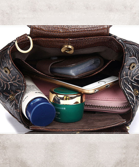 Fashion Dark Coffee Branch Embossing Calf Leather Tote Handbag
