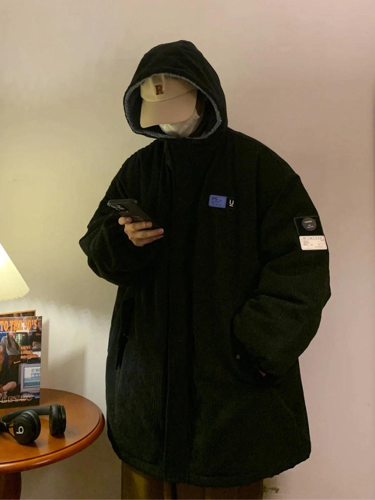 Stay warm in style with this corduroy and ribbed puffer jacket, lined with faux fur for added coziness. The baggy style, zip and button fastening, elasticated cuffs, and label details on the sleeve and chest enhance its appeal. This men’s jacket is versatile for casual, comfy, school, or winter streetwear.