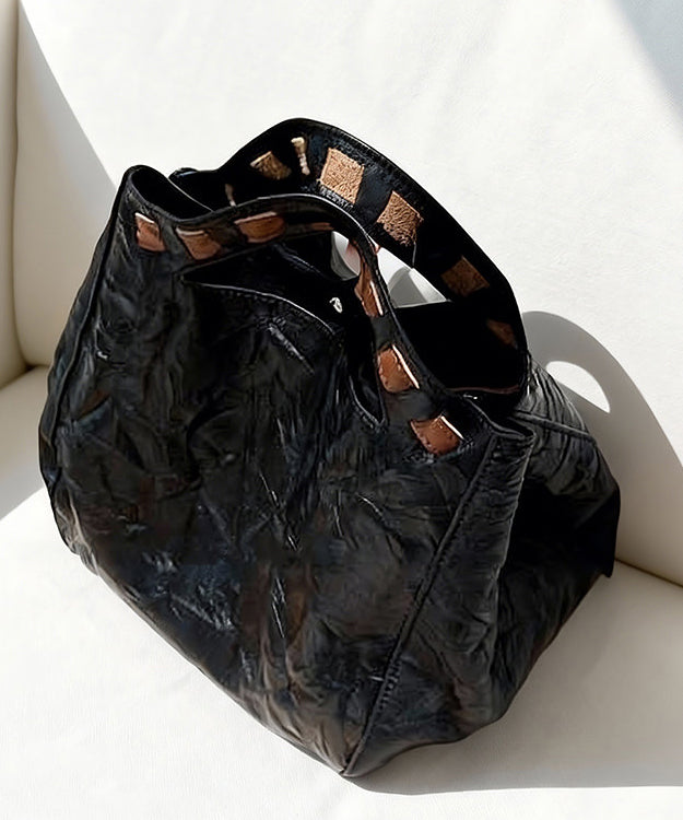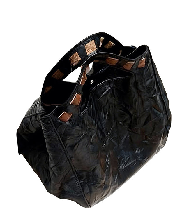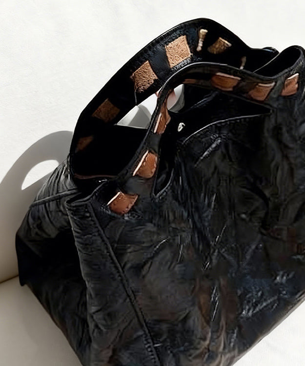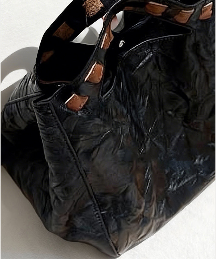 Fine Black Wrinkled Large Capacity Leather Tote Handbag
