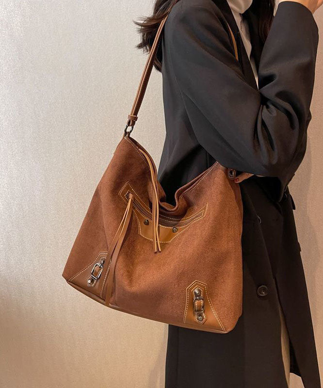 Fine Brown Rivet Patchwork Zip Up Faux Leather Satchel Handbag