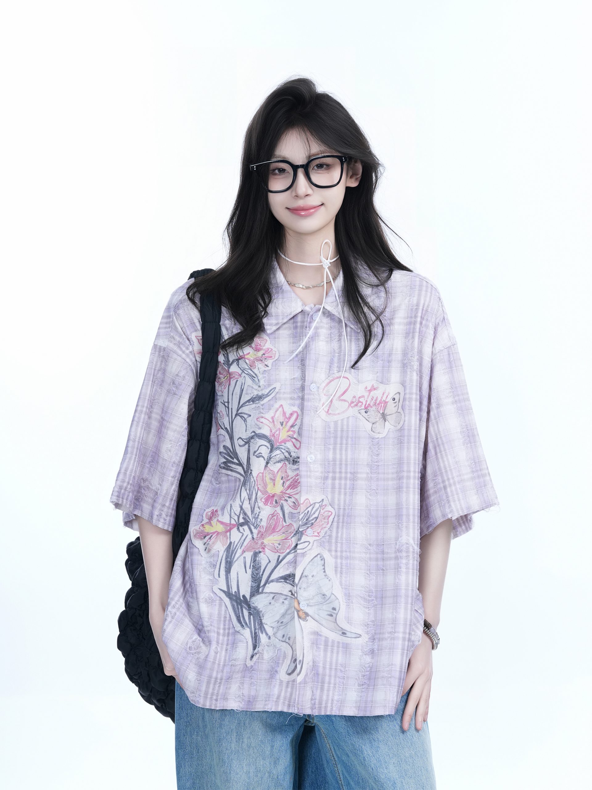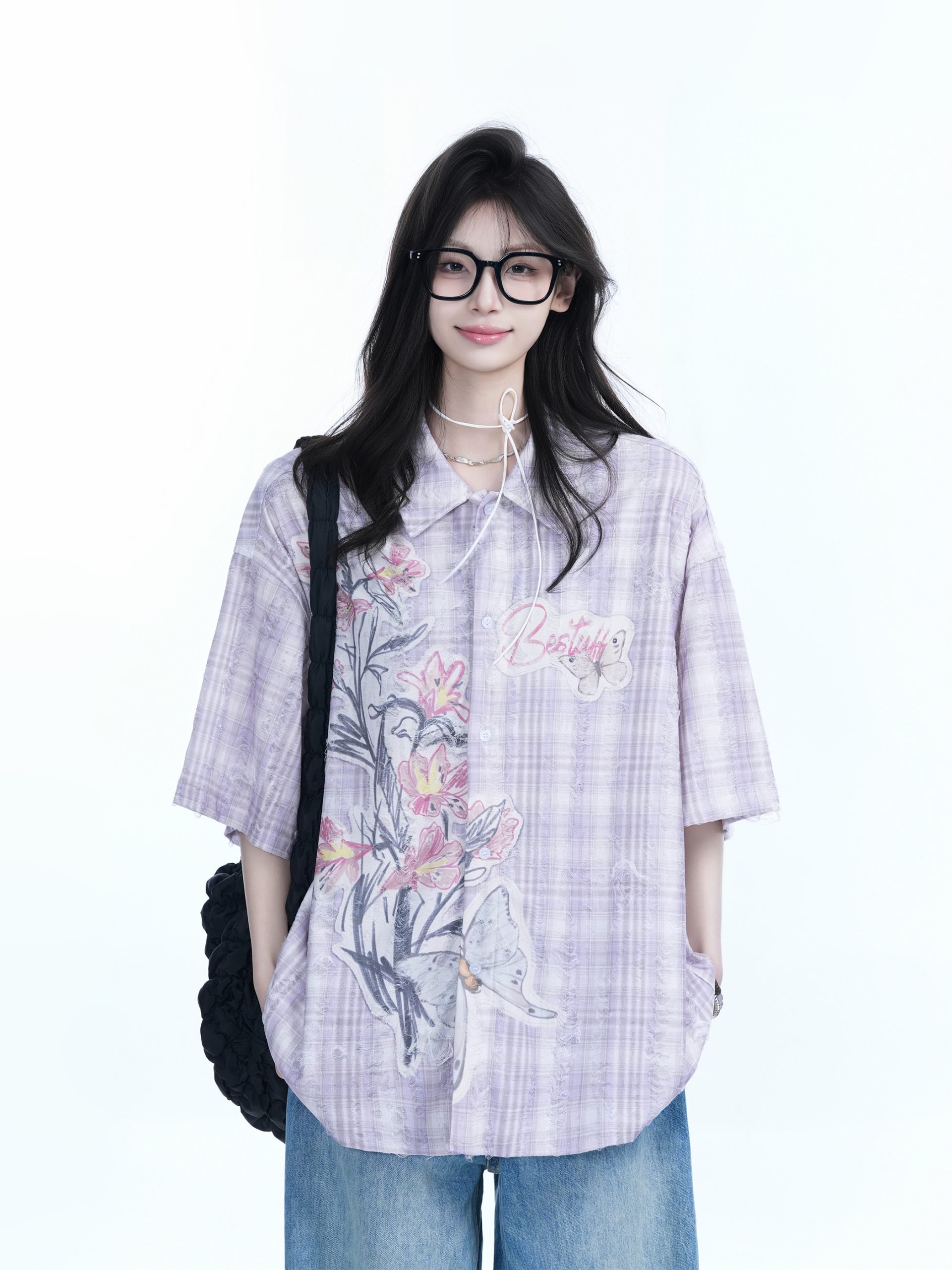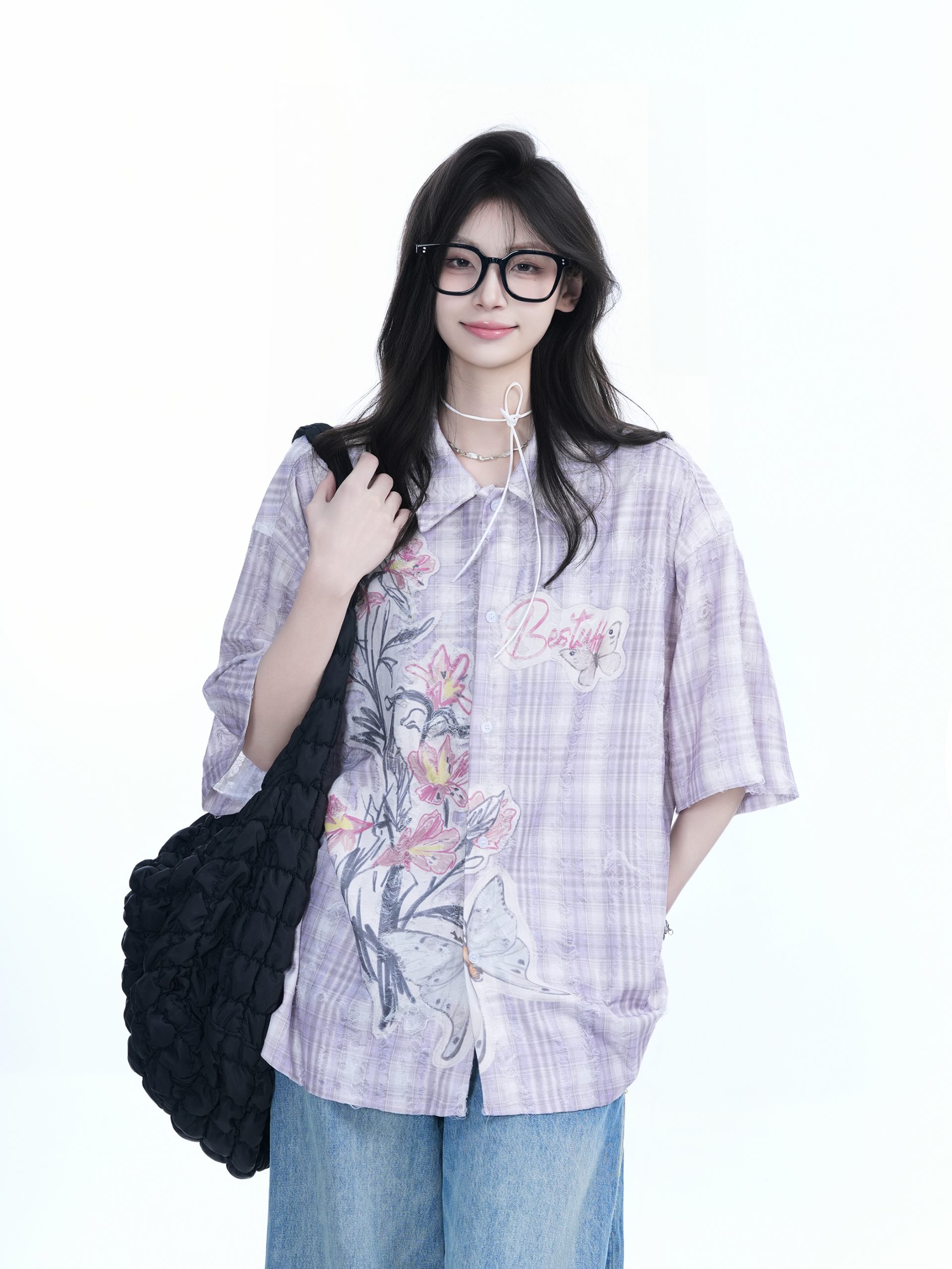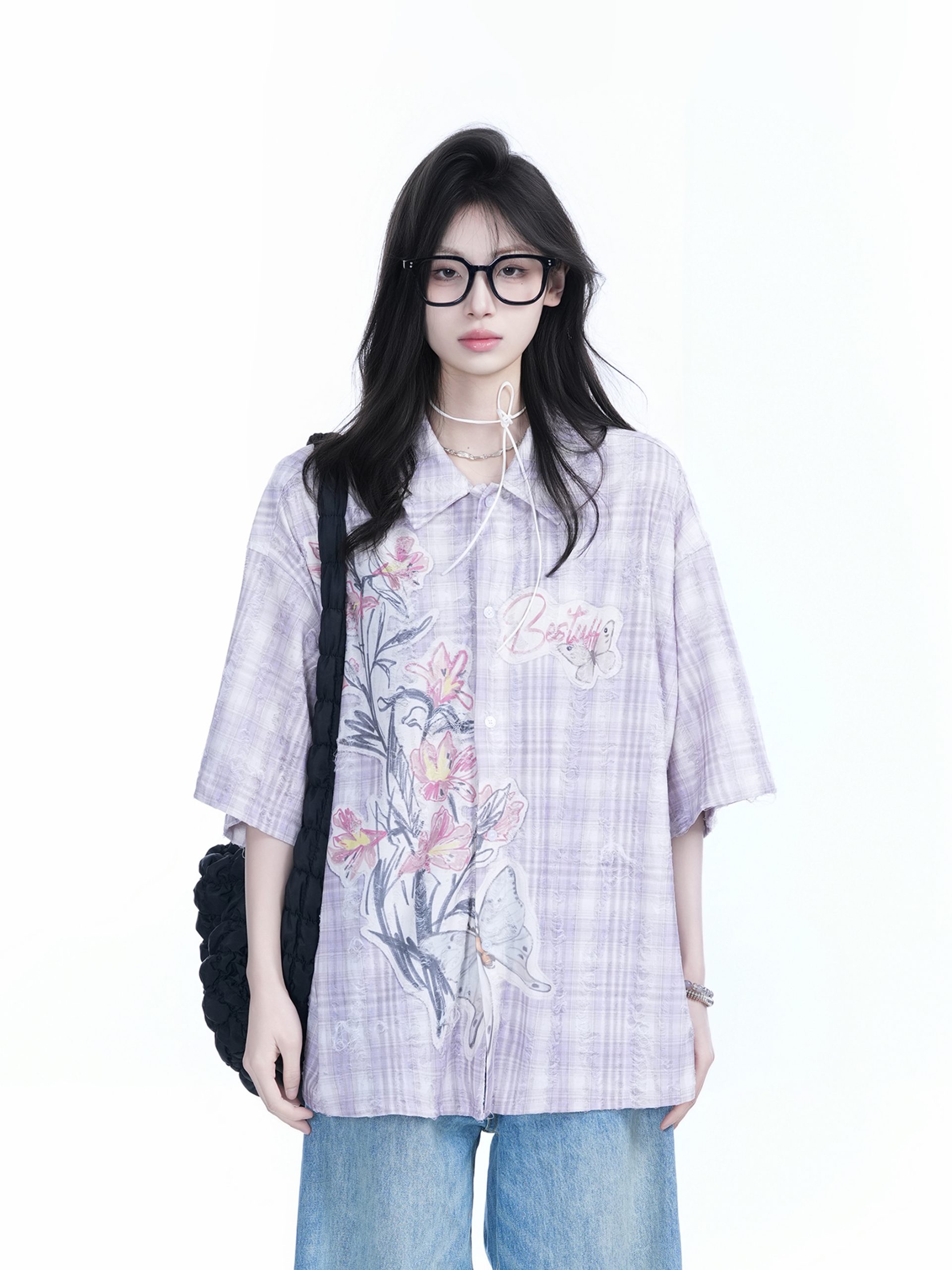 Floral Embroidery Pink Purple Checkered Short Sleeve Shirt Women Loose Fit, Y2K High-quality product featuring prom dresses, spring outfits, business casual outfits and more. Modern design that fits the latest trends. Premium materials ensure durability and comfort. Order now for special offers! Product designed with attention to every detail. Suitable for all occasions and personal styles.