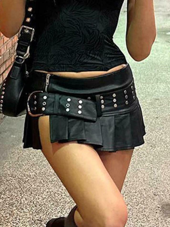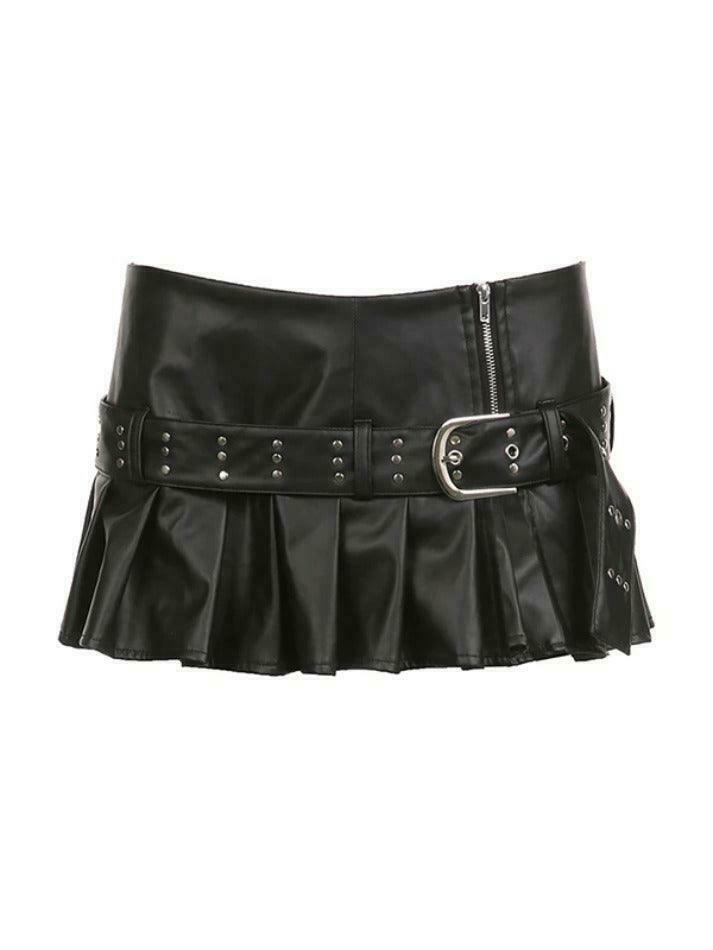 Punk and Vintage Vibes: Embrace edgy fashion with this rivet-belted leather mini skirt, exuding punk and vintage style.