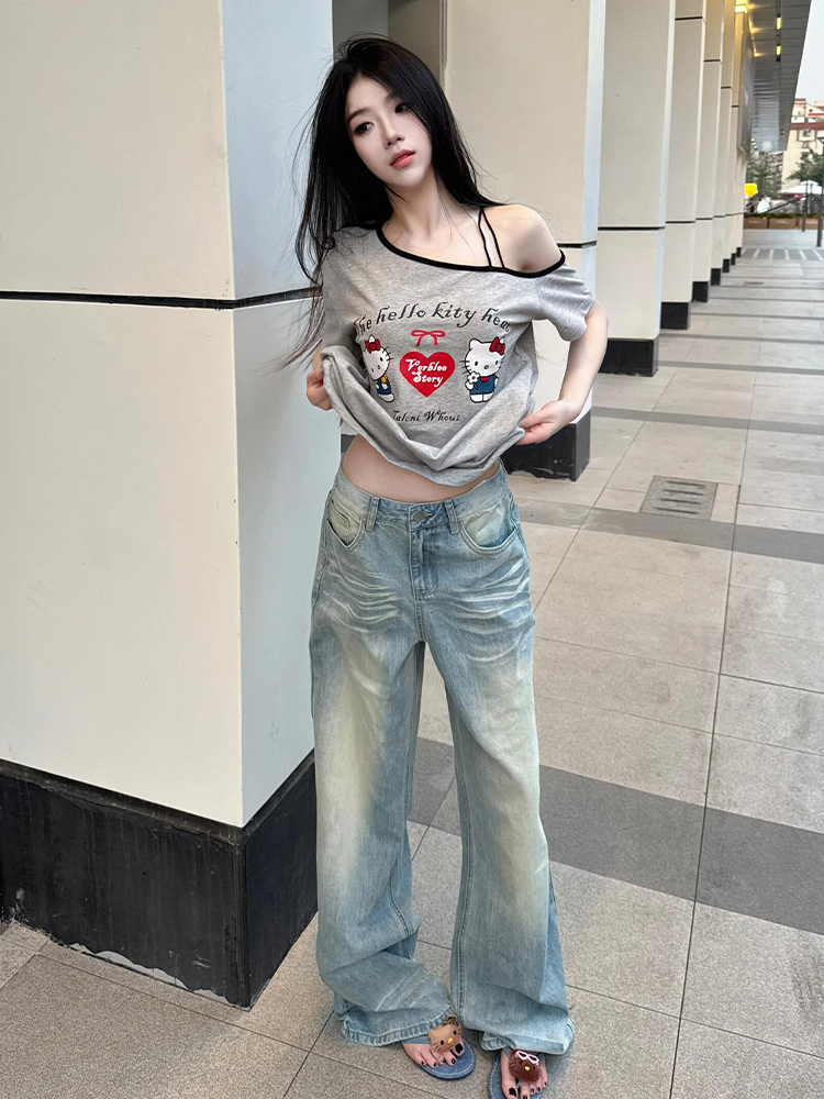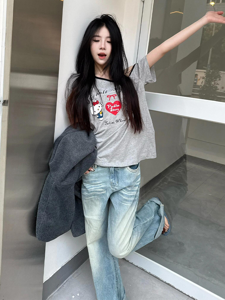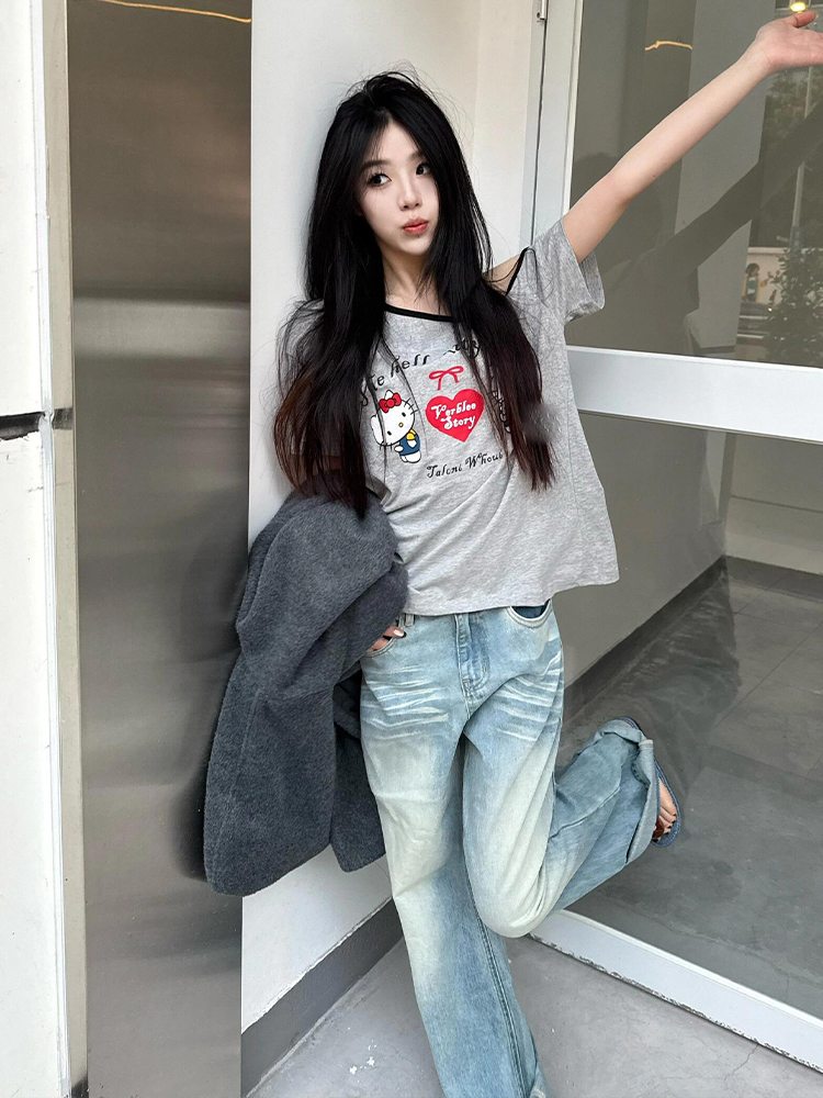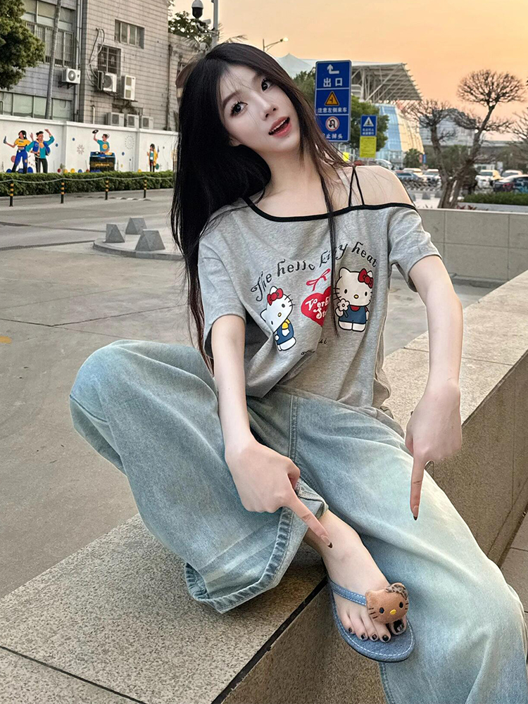 Gray Off Shoulder Short Sleeve Women Summer Loose Hello Kitty Print Casual Top High-quality product featuring prom dresses, spring outfits, business casual outfits and more. Modern design that fits the latest trends. Premium materials ensure durability and comfort. Order now for special offers! Product designed with attention to every detail. Suitable for all occasions and personal styles.