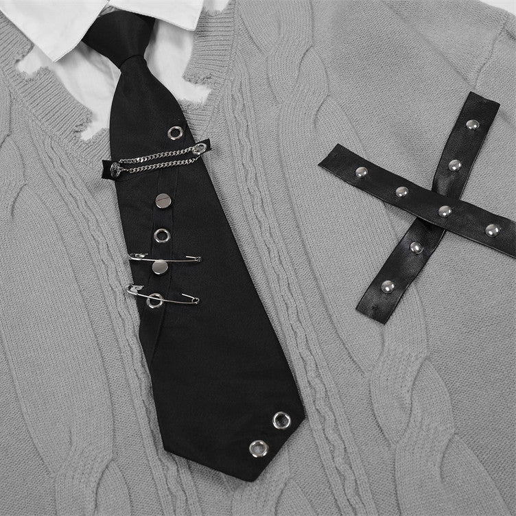This grunge-academia sweater brings a unique layered look with its attached shirt collar and matching tie detail. The distressed knit texture adds a worn-in, alternative feel, while the oversized silhouette keeps it comfortable for daily wear. The added strap and metal hardware on the tie elevate the design with a subtle edgy twist. Perfect for modern men’s fashion, it pairs easily with cargos, straight-leg denim, or boots. Ideal for anyone wanting a standout top that mixes clean academia elements with a darker, alternative men style edge.