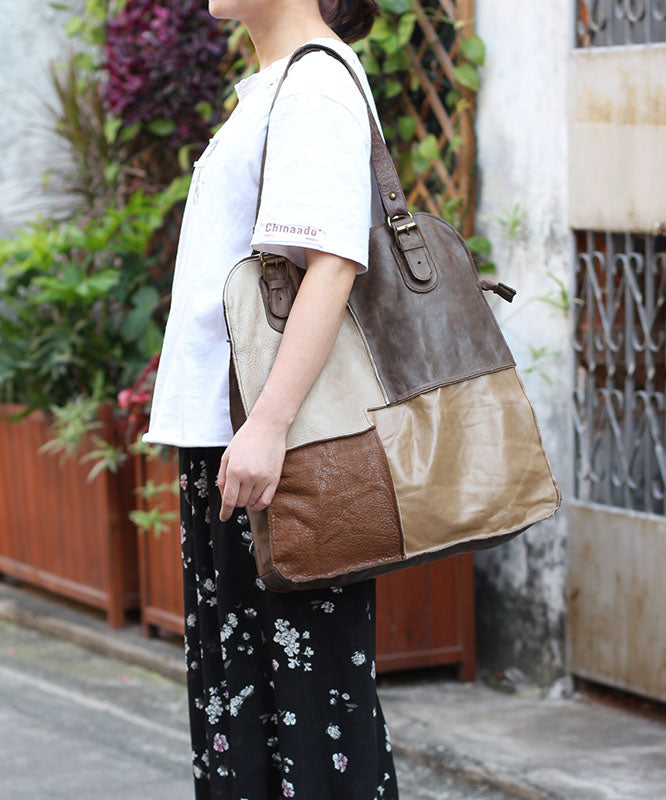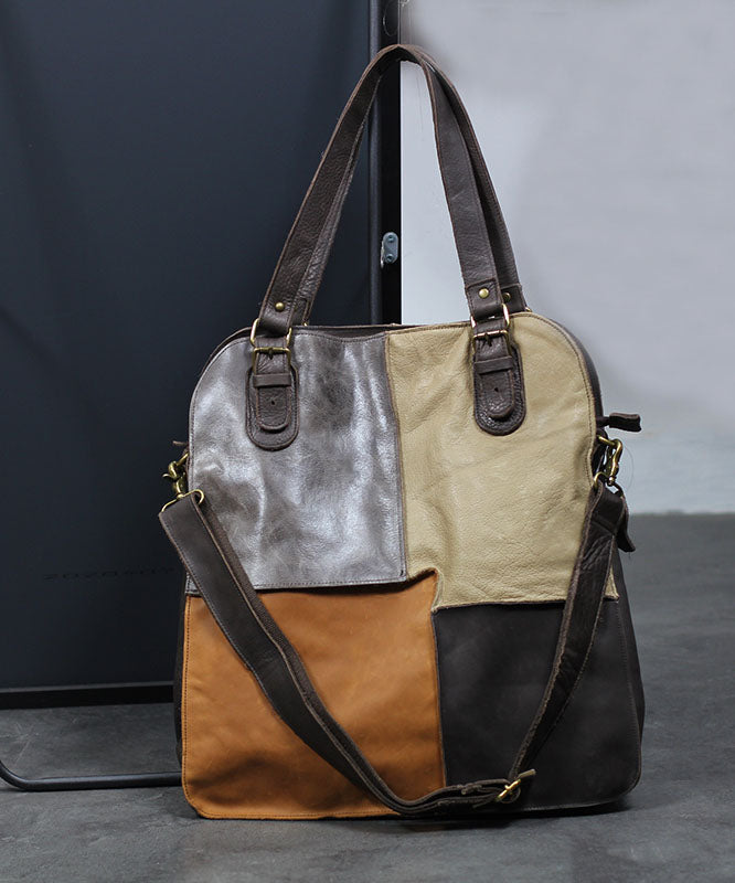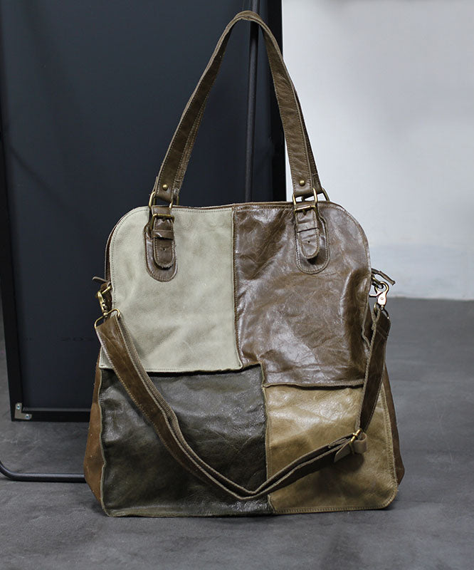 Handmade Khaki Colorblock Patchwork Calf Leather Satchel Handbag