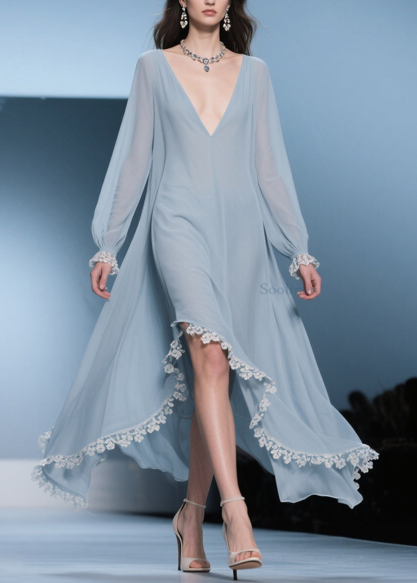 Italian Blue Asymmetrical Lace Chiffon Long Dresses Lantern Sleeve