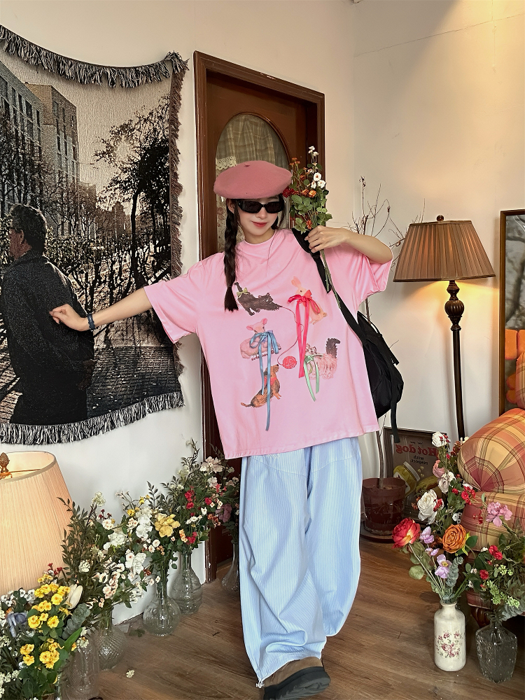 Embrace your playful side with our Japanese Retro Cute Cat Print Short Sleeve T-Shirt for Women! Featuring an adorable cat graphic, a charming bow detail, and a flattering round neck, this fun Y2K style top offers a loose fit that ensures all-day comfort. Perfect for casual outings or cozy lounging, this tee is a must-have addition to your wardrobe. Don’t miss out on this stylish piece—add it to your cart today!
